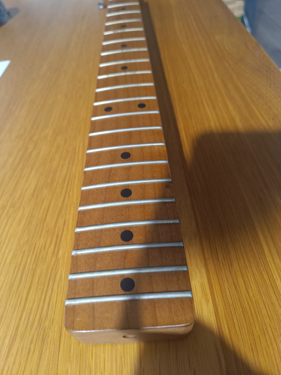 Vendo este mástil USA de Musikraft, licenciado para cuerpo Fender. Roasted maple, 21 trastes en buen estado. Va con un clavijero Kluson Deluxe, aunque le faltan dos tornillos ...