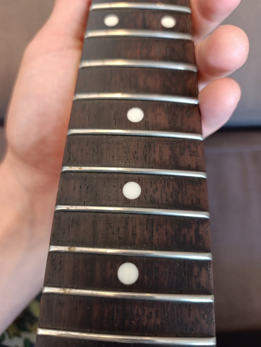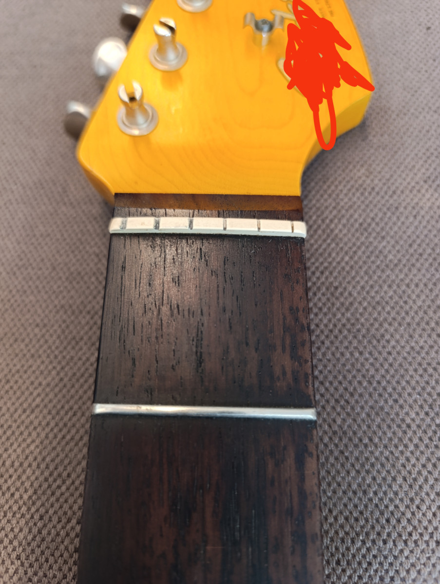 - Trastes muy bien redondeados al final, un trabajo excepcional al nivel de mástiles USA. Son más bien altos, tipo vintage. Todavía sin desgaste.