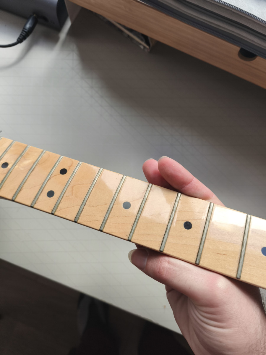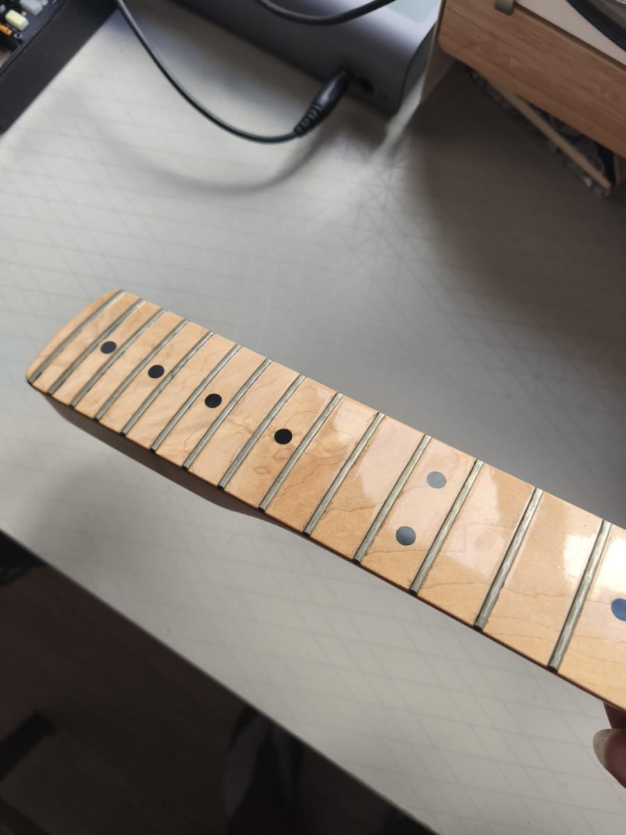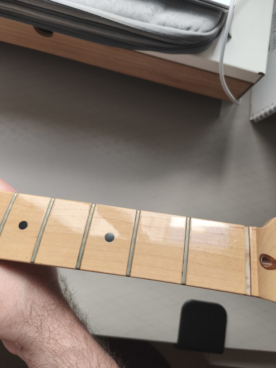 Los trastes están fundidos, de ahí el precio. Respecto a la laca, está bien y el alma funciona. Un abuena oportunidad para ponerle los trastes a gusto y bien nivelados (no como vienen muchas Fender) por un luthier.