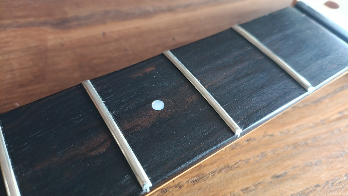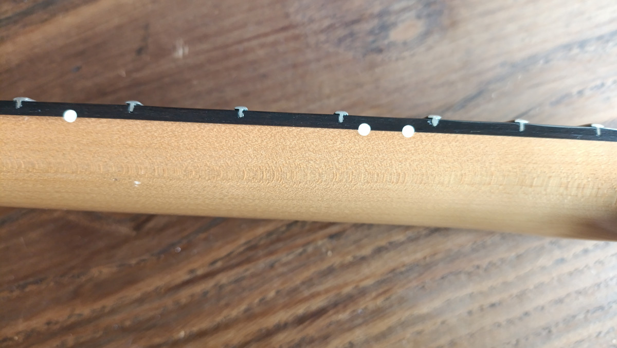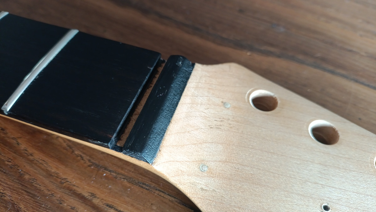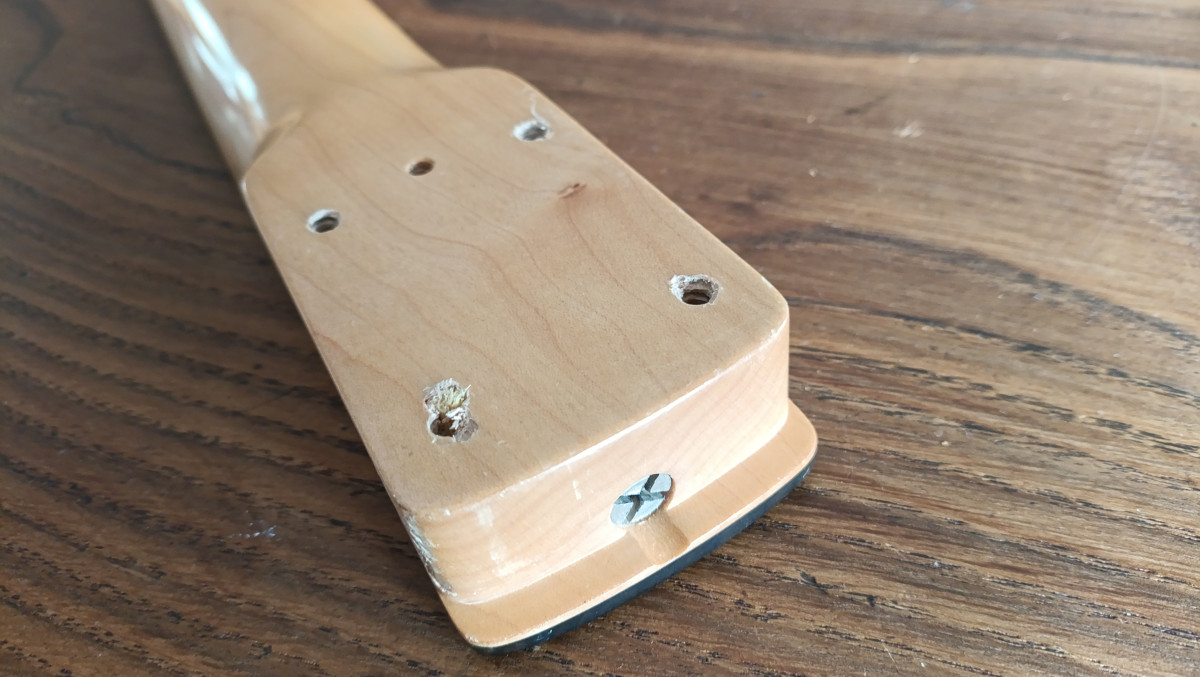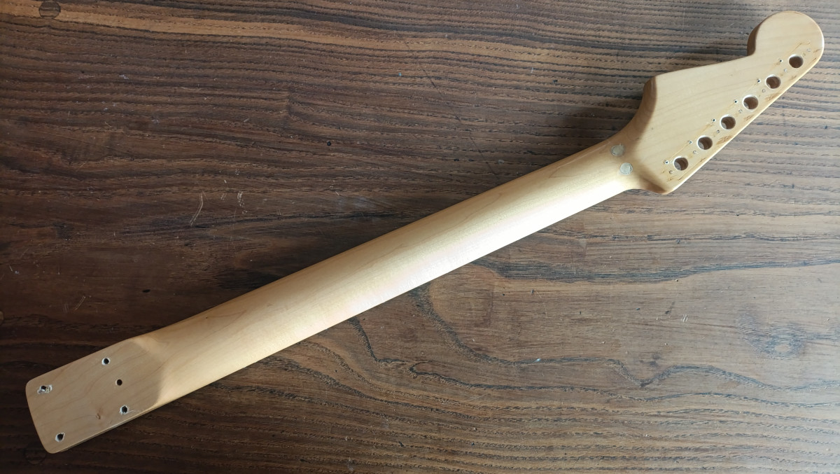 Mástil de stratocaster de arce con diapasón de ébano, hecho en Japón. Estaba preparado para una cejuela de bloqueo, pero rellené los huecos traseros y le puse una pieza de ébano en la parte superior del diapasón.