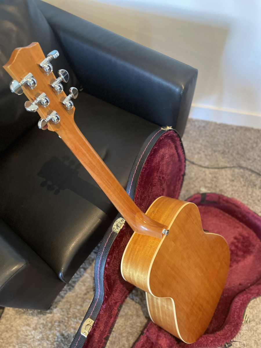 Arce de Queensland australiano, palorrosa precioso, que hace que la guitarra suene acústicamente muy equilibrada y que probablemente tiene el mejor sistema de amplificación de acústicas, con posibilidad de mezclar piezo y micro así como la capacidad de ecualízar el sonido.