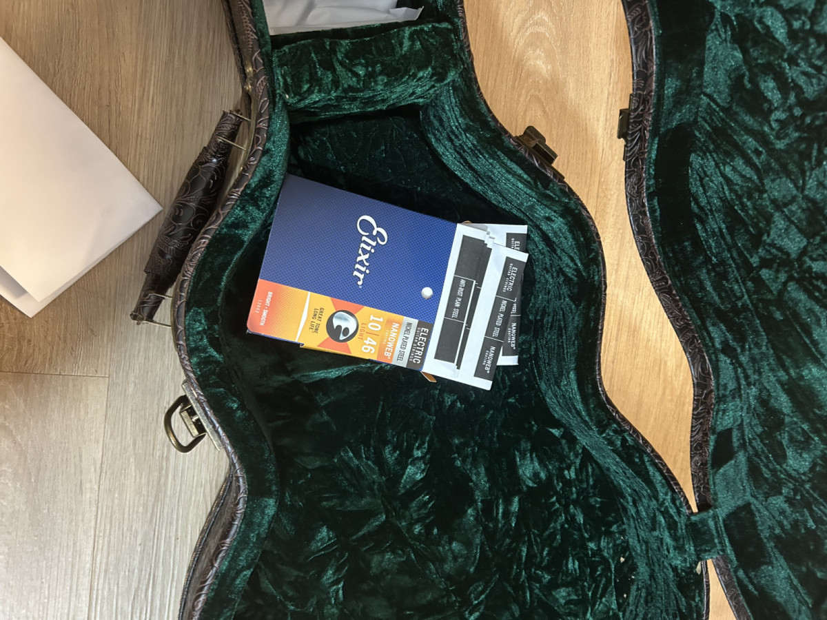 Es una paula de alto nivel, con unas pastillas que suenan de escándalo, y acabado ligeramente envejecido. Incluye el estuche original, con un acabados de lujo, y un juego de Elixir 10-46 que hay dentro sin usar.