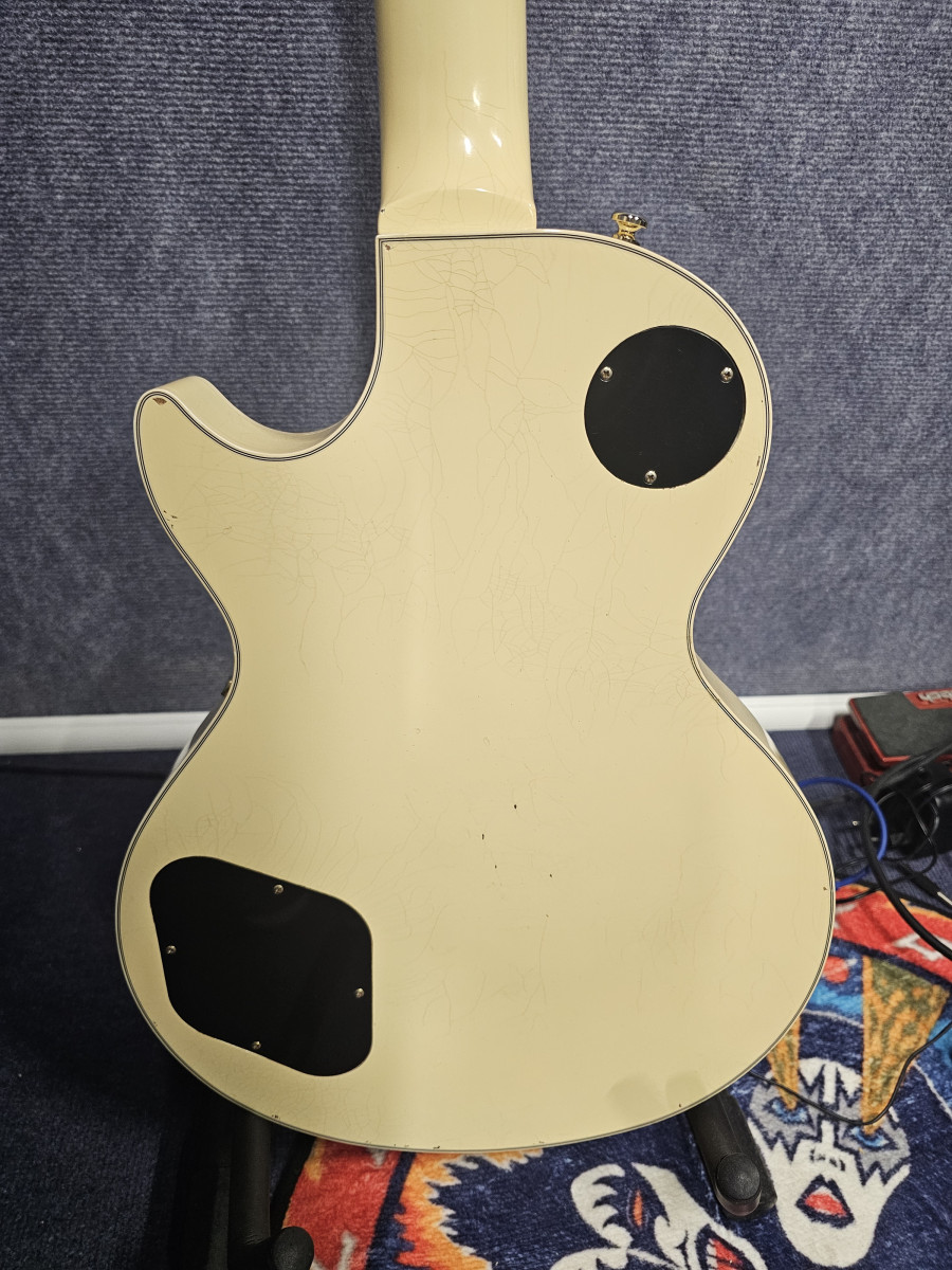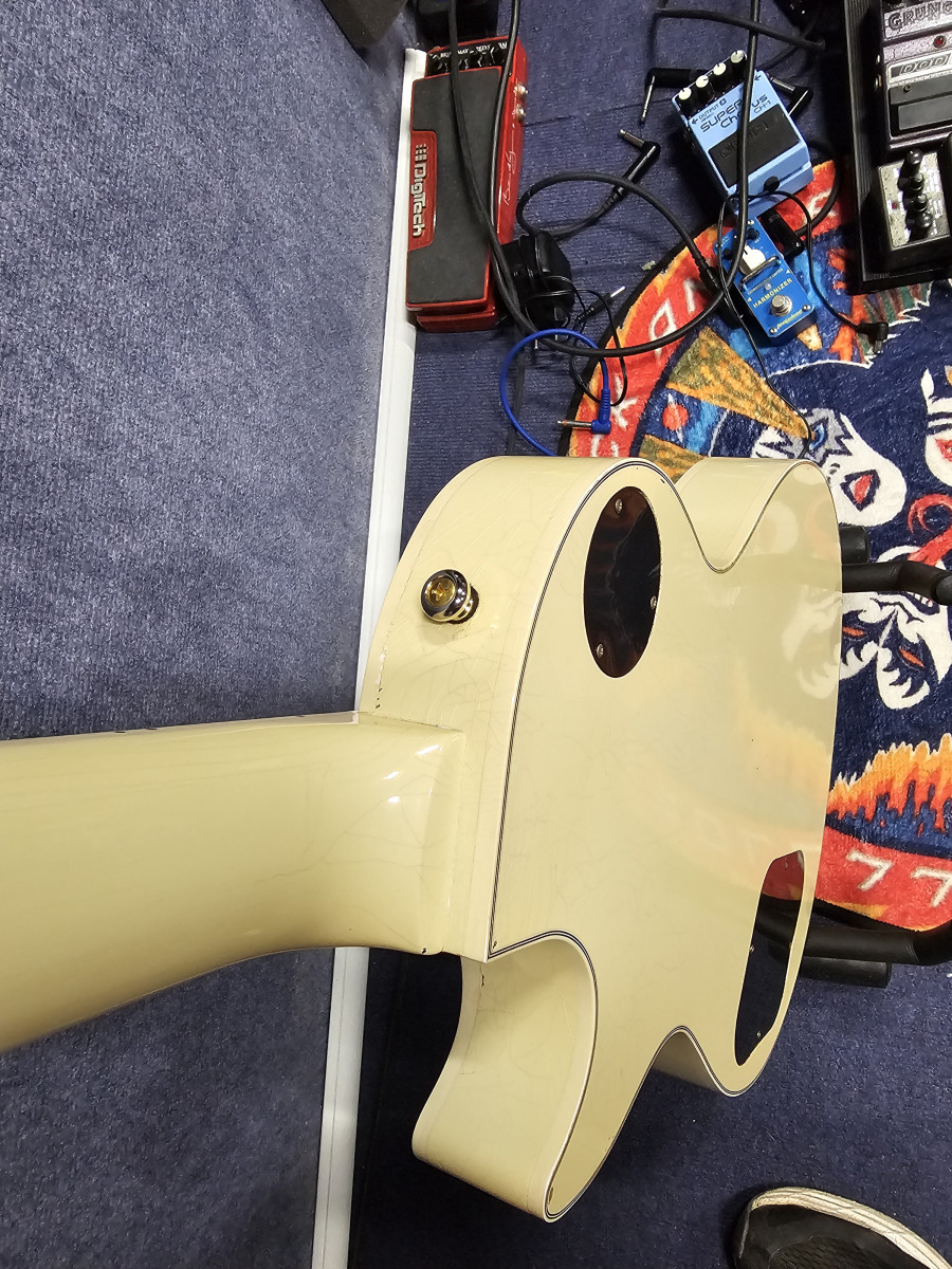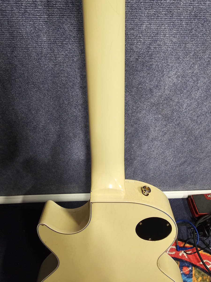 Guitarra Maybach Lester 72' en color blanco crema. Tiene un aspecto elegante y está en buenas condiciones. Es una guitarra con relic de serie y en este año 2018, con un craquelado auténtico.