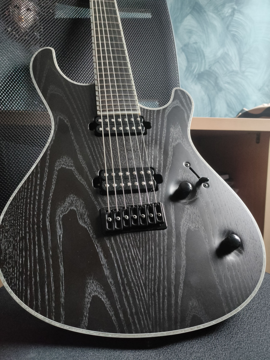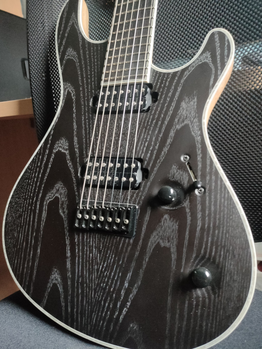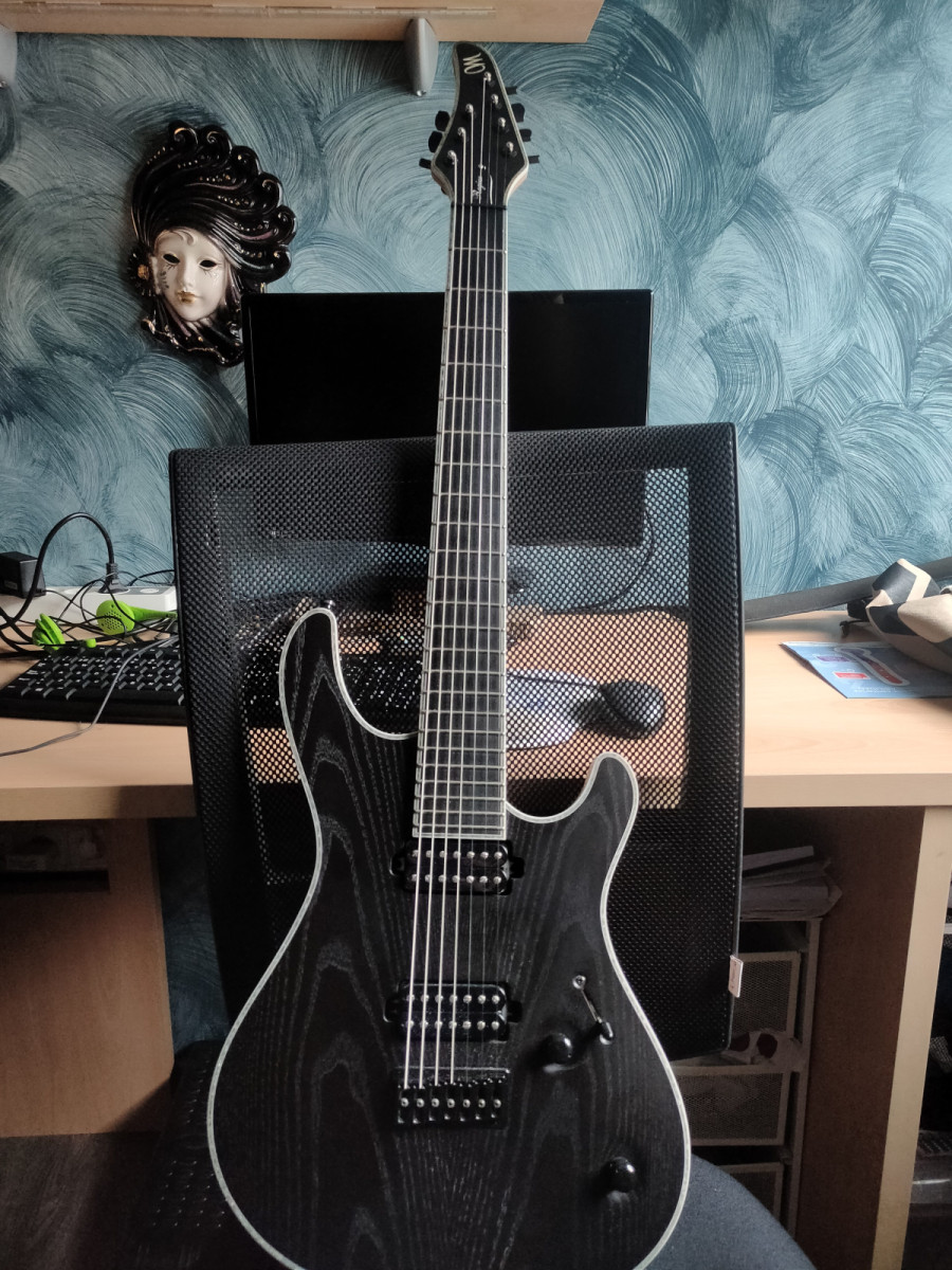 En este caso es una Mayores Regius 7 Gothic-T. Las Gothic-T se distinguen de las Gothic normales porque son barítonas, llevan pastillas Bare Knuckle Aftermath de serie, y las maderas las seleccionaban mas (o eso decían). Fueron una edición limitada, ya agotada, que pertenecia a lo que llamaron Djentlemen series, en las cuales agruparon las Gothic de Acle Kahney de Teserract o Misha Mansoor de Periphery.