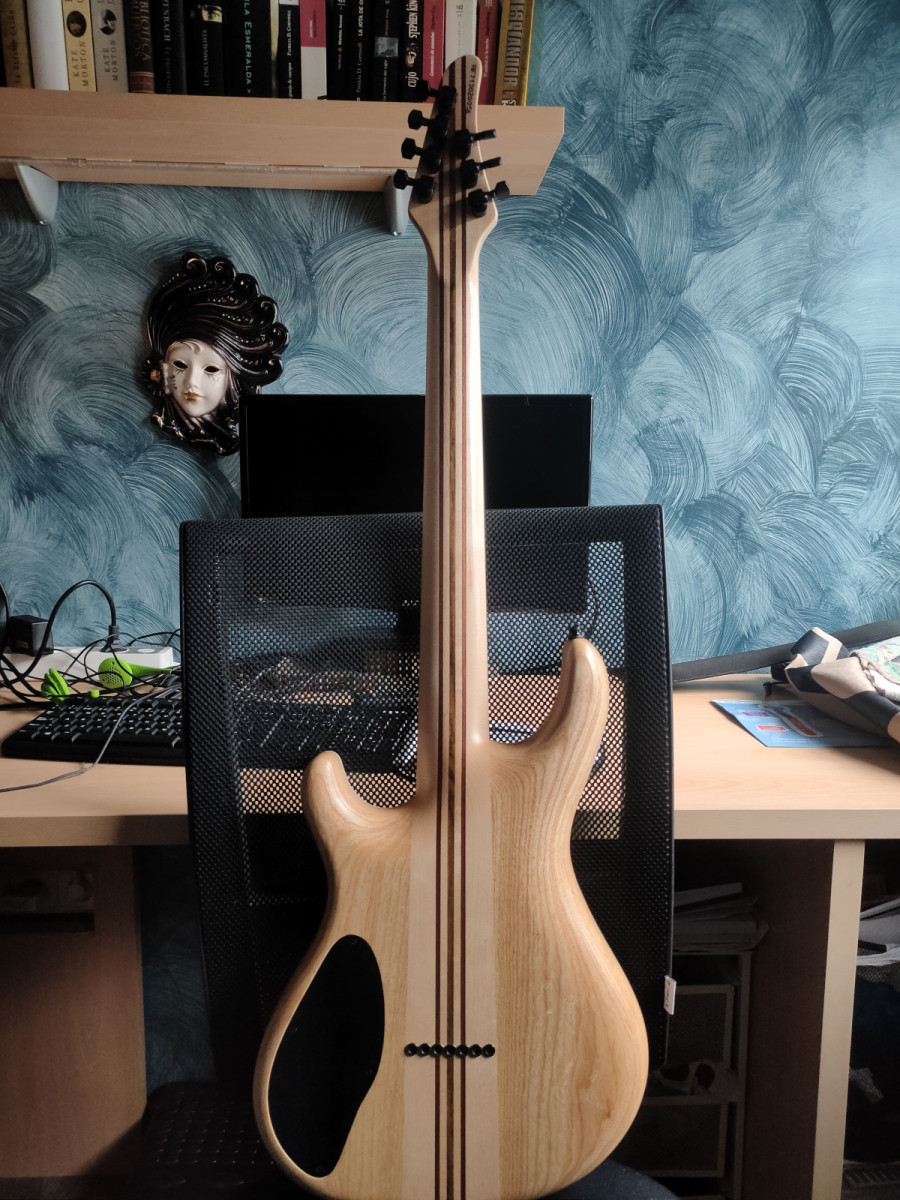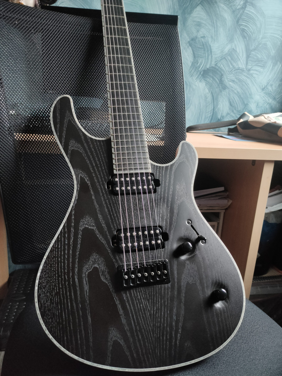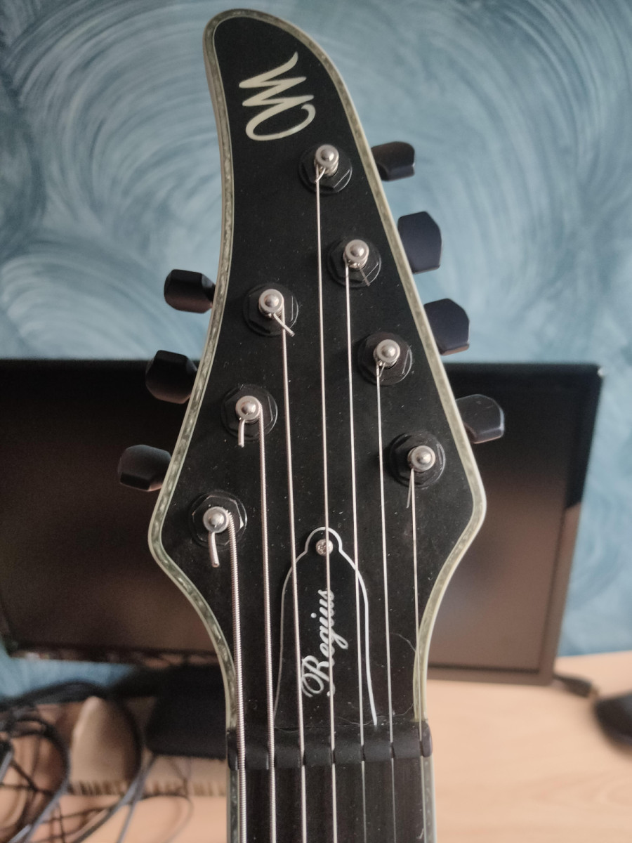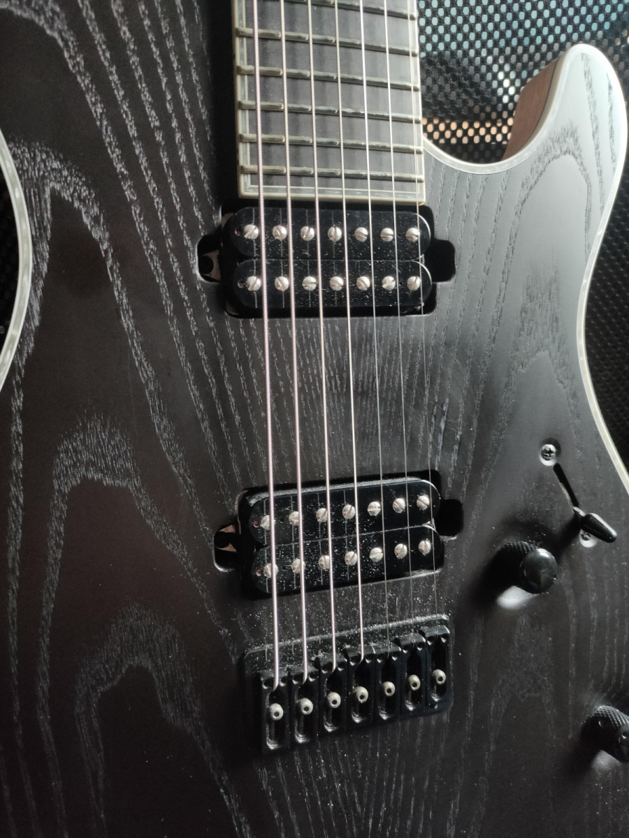 En este caso es una Mayores Regius 7 Gothic-T. Las Gothic-T se distinguen de las Gothic normales porque son barítonas, llevan pastillas Bare Knuckle Aftermath de serie, y las maderas las seleccionaban mas (o eso decían). Fueron una edición limitada, ya agotada, que pertenecia a lo que llamaron Djentlemen series, en las cuales agruparon las Gothic de Acle Kahney de Teserract o Misha Mansoor de Periphery.