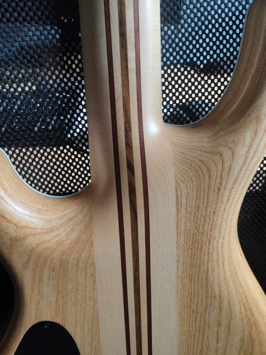 Cuerpo de fresno, mastil estandar de 11 piezas de las Regius, tapa de fresno tintada de negro, diapasón de ébano, escala 27", pastillas BKP Aftermath, clavijeros Sperzel de bloqueo, puente ABM, estuche rigido Hiscox.