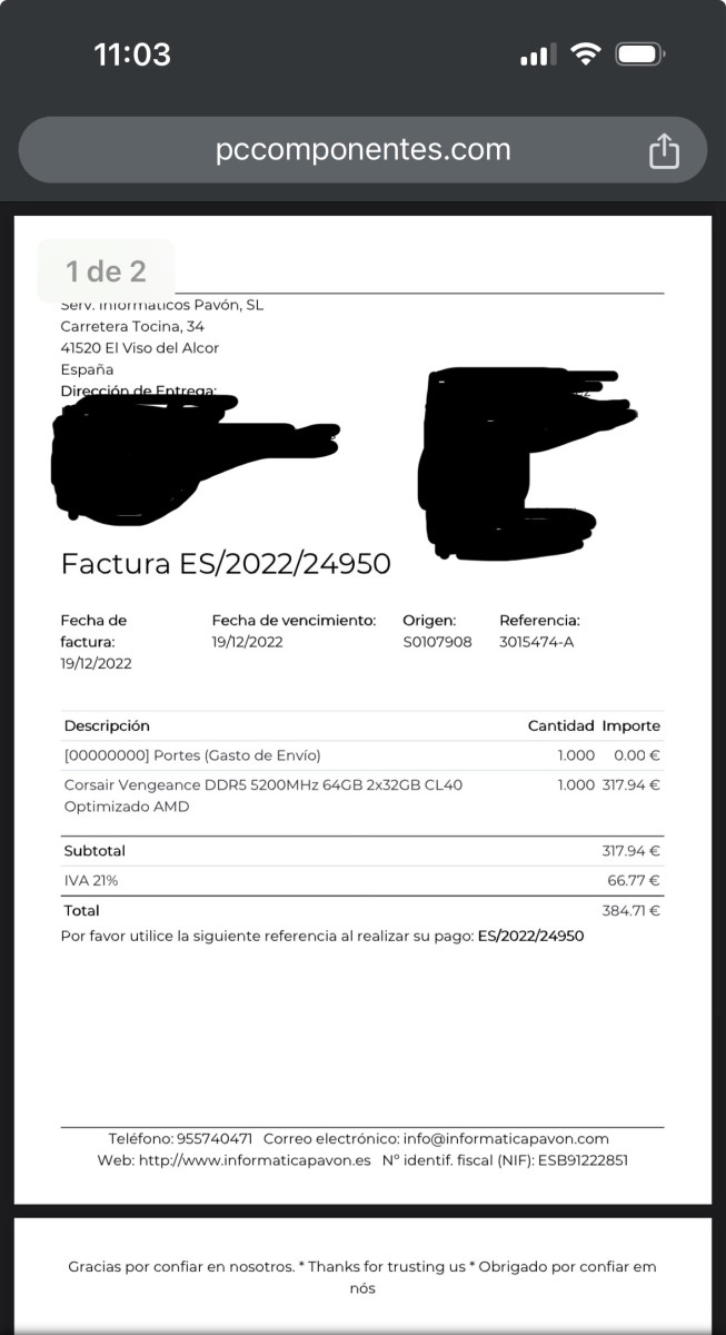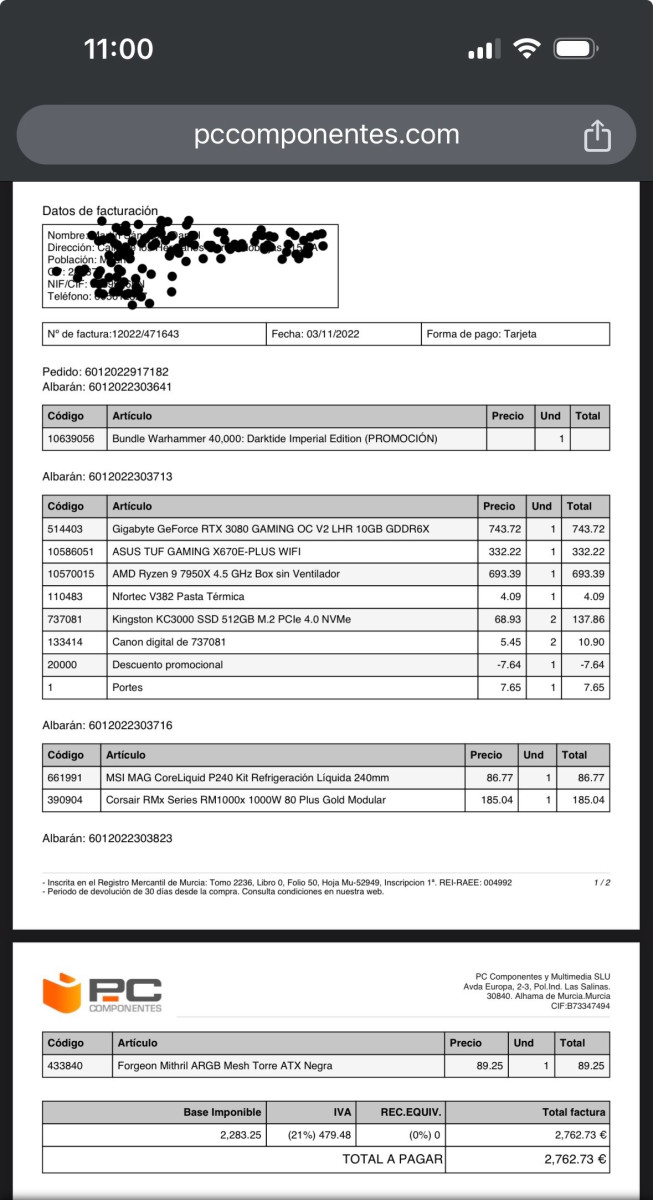 saco para cambio este ordenador montado con componentes de alta calidad en base al chip AMD Ryzen 7950X. El objetivo de este ordenador era funcionar a alto nivel en Renders 3d, como diseño gráfico y música por supuesto. La realidad es que no he puesto la máquina a más del 15% de su rendimiento. Fueron 3144€ de factura total. Y creo que es hora de que alguien le saque el partido que se merece. Dejo unas fotos de la factura para que se vean los componentes. Conservo las cajas de todo o casi todo.