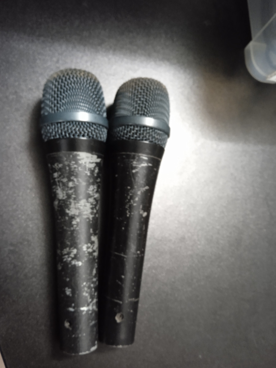 Par de micrófonos Sennheiser E945 usados. Están en buen estado, aunque muestran señales de uso, funcionando perfectamente.