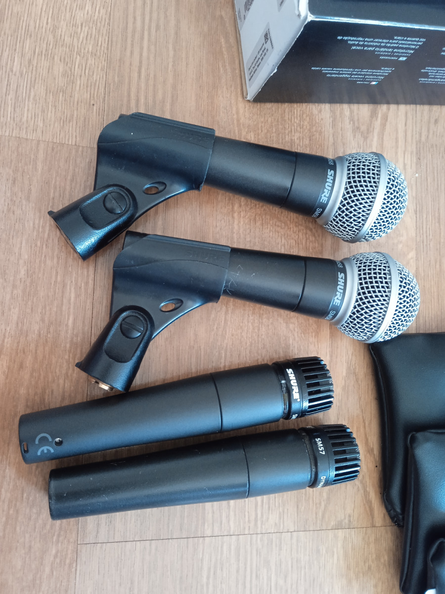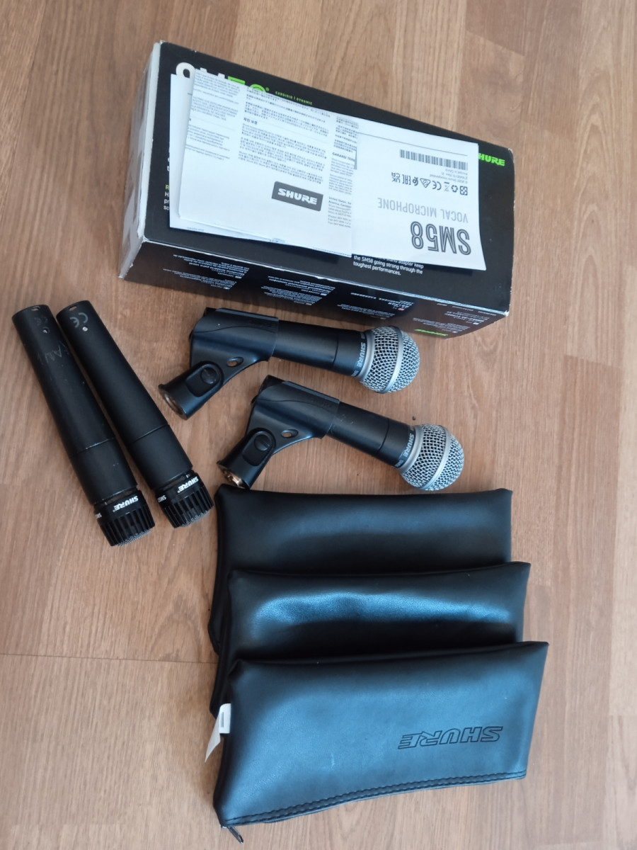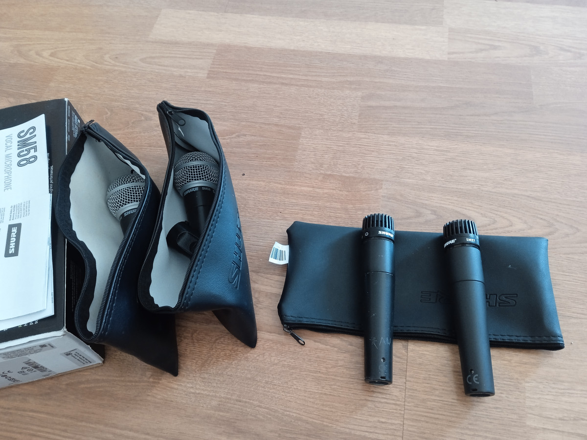 Vendo cuatro micrófonos: dos Shure SM57 y dos Shure SM58. Están en buen estado y se incluyen con sus respectivas pinzas y fundas y una caja los 58 y Ideales para estudio o directo. - Dos micrófonos dinámicos Shure SM57.(Una funda)