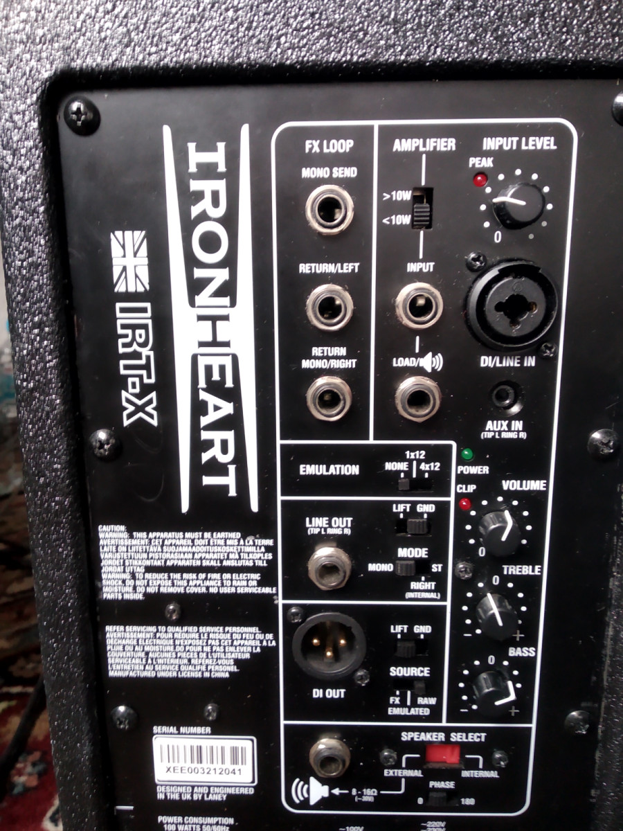 Monitor de audio FRFR Laney Ironheart IRT-X Cabinet potencia: 200 Watt RMS ICE ( Class D ) altavoz: 8" Bass-Driver ( Flat Response), 1" Tweeter. Dispone de un bucle Stereo FX, salida XLR DI, entrada AUX, salida de emulación, una opción StereoLink y una salida de audio integrada