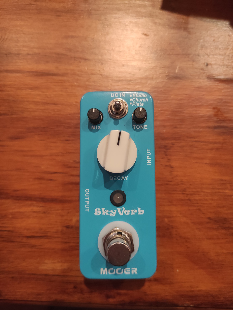 Pedal de reverb de mooer. Bonito y barato. Tiene la calidad que tiene, no es malo. Es interesante para usos concretos, al final casi no ocupa espacio en la pedalera. Es de segunda mano pero está en muy buen estado.