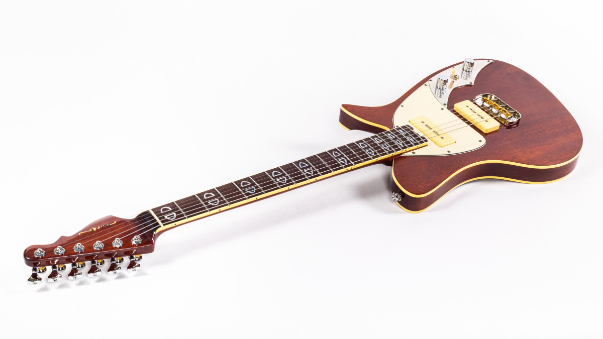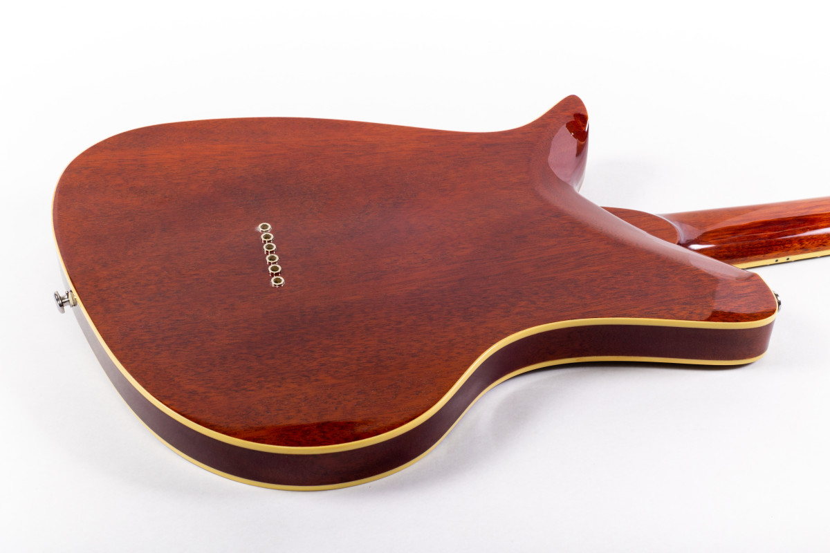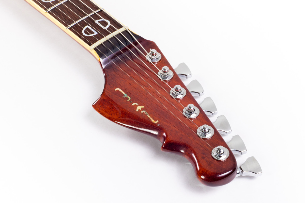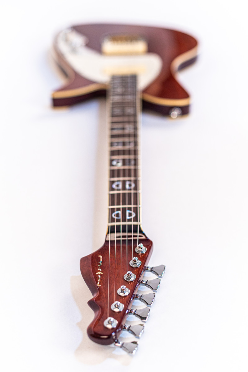 Maravillosa, elegante, comodísima...hacia tiempo que no hacía este modelo, y bueno, nunca hay 2 iguales en ningún sentido, esta vez he hecho una unión de mástil encolado con rebajes para acceder bien bien a los trastes superiores. El cuerpo es de 1 pieza de caoba de honduras, que realmente viene de Brasil y que lleva conmigo unos cuantos años, tiene un 7.5% de humedad y lo he hecho especialmente finito, ya que este diseño tiene un cuerpo más grande de lo que aparenta y no quiero pesos de instrumento que no estén relativamente contenidos. La guitarra pesa 3.2kg. El mástil también es de 1 pieza de caoba de honduras, en este caso al estar cortado algo más fino se ha ido secando mejor con los años y tenía en torno al 6% de humedad cuando empecé a construirla, que es una humedad idílica para que un mástil sea estable y no de problemas. El perfil es oval, con los bordes redondeaditos, y los trastes semiesféricos en los bordes, super agradable, grosor medio de 21mm en traste 1, 23mm en traste 12. Radio 12" como casi siempre hago, en un diapasón de palosanto de Madagascar maravilloso, con la veta muy recta y muy uniforme, 7/8% de humedad. Inlays de madreperla de 2mm de grosor, no laminados ni plásticos raros. Logo en Abalone incrustado en la pala. Pala diseño Batman o dragón, depende de en qué momento del día me encuentre...con clavijas Hipshot escalonadas y de bloqueo, las mejores clavijas que se pueden encontrar junto a Schaller.