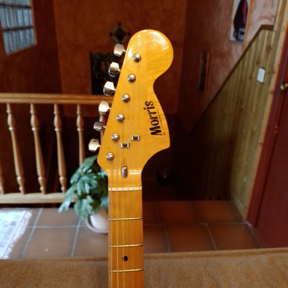 Se trata de una guitarra que ha envejecido estupendamente, fabricada en Japón por la casa Morris en los años 70, tiene mas de 40 años. Está con todo original, salvo el puente que es nuevo (tiene palanca de tremolo), también entrego el puente anterior; los trastes están en buen estado, tiene muy pocas marcas de uso, el alma funciona y suena muy bien enchufada, ya que desconectada resuena como una campana. La enviaría en un estuche antiguo pero plenamente funcional.