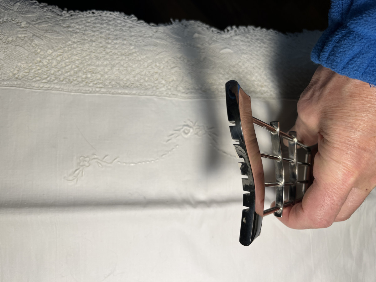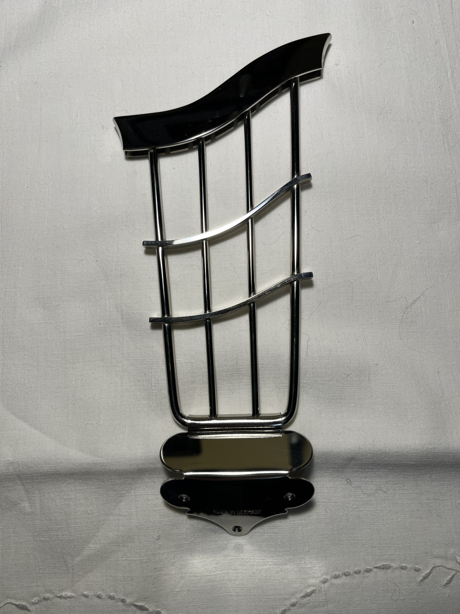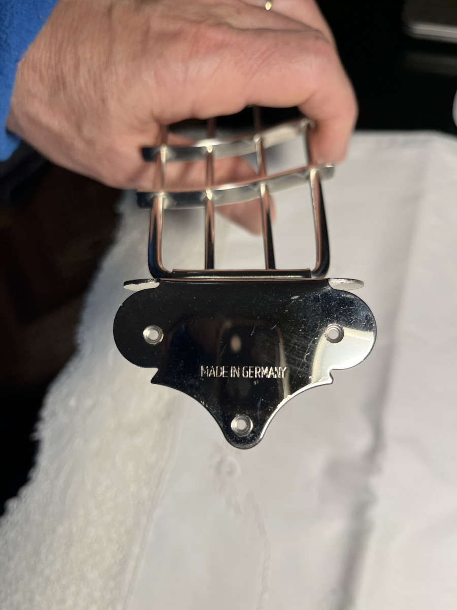 Este (NOS) trapeze/tailpiece es muy difícil de encontrar. Lo compré hace muchos años a un coleccionista quien me contó que es una pieza a estrenar hecha en Alemania hace muchos años. Tiene aspecto de totalmente nuevo desde luego.