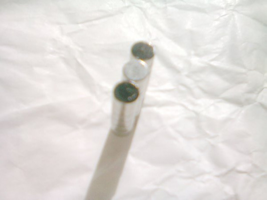 18 nucleos de imán nodimio para modificar las pastillas clásicas de ceramica single coil con estos imanes permanentes para lograr un sonido SuperStrato en las guitarras electricas Fender, Stratocaster, Telecaster, Squier, Yamaha, Cort etc con pastillas single coil, dándo un sonido más claro y definido que el álnico. Nucleos de disco de 5mm x 3mm con la dirección de la magnetización en la dirección del espesor. Están polarizados con punto negro; punto negro = S. En mano o envio 1€ más.