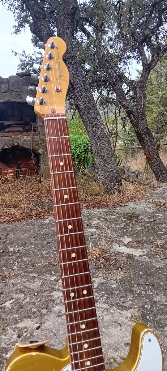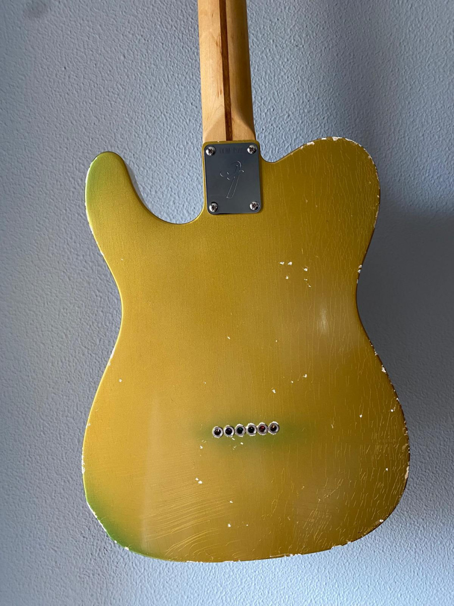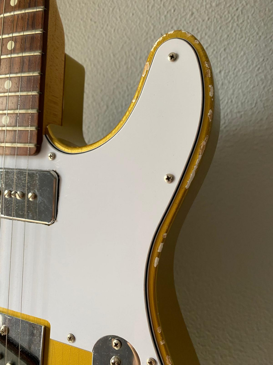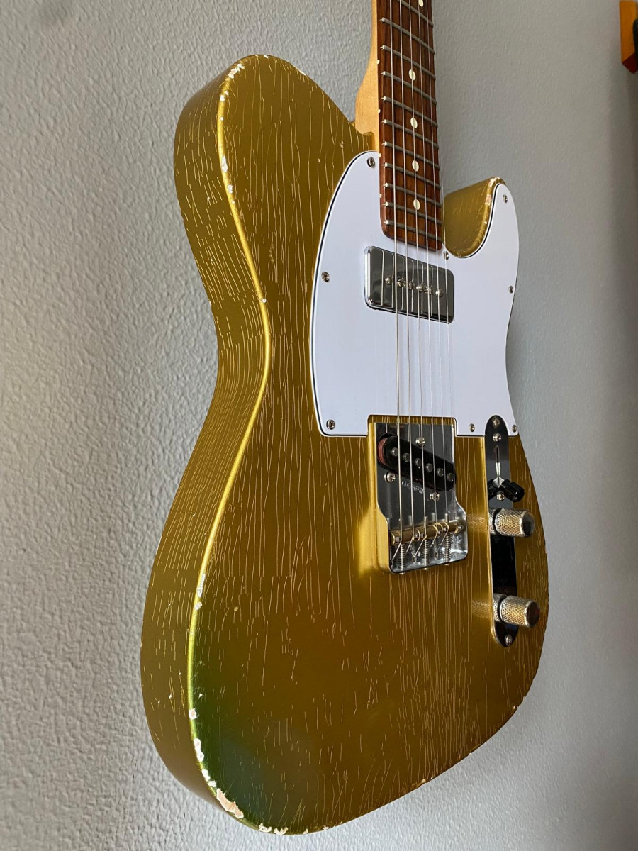 Preciosa Tele con cuerpo MJT tipo custom, mástil de palorrosa Fender USA, p90 en el mástil y un precioso acabado en Mystic Aztec Gold.