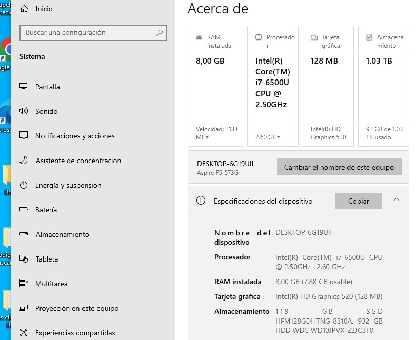 Almacenamiento: SSD 128GB+ 1000GB HDD.
