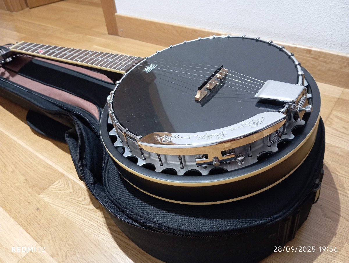 Banjo de 6 cuerdas Ortega OBJE350/6-SBK en acabado negro. Lo he utilizado un par de veces para un proyecto que no cuajó. Se toca como una guitarra pero yo lo he estado tocando como un banjo de 5 cuerdas mediante un inventillo que vi por la web. Lo puedo entregar como está o con las 6 cuerdas. El banjo viene con piezo para tocar amplificado.