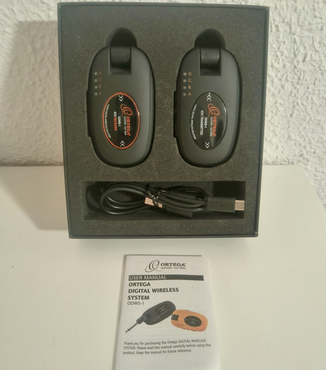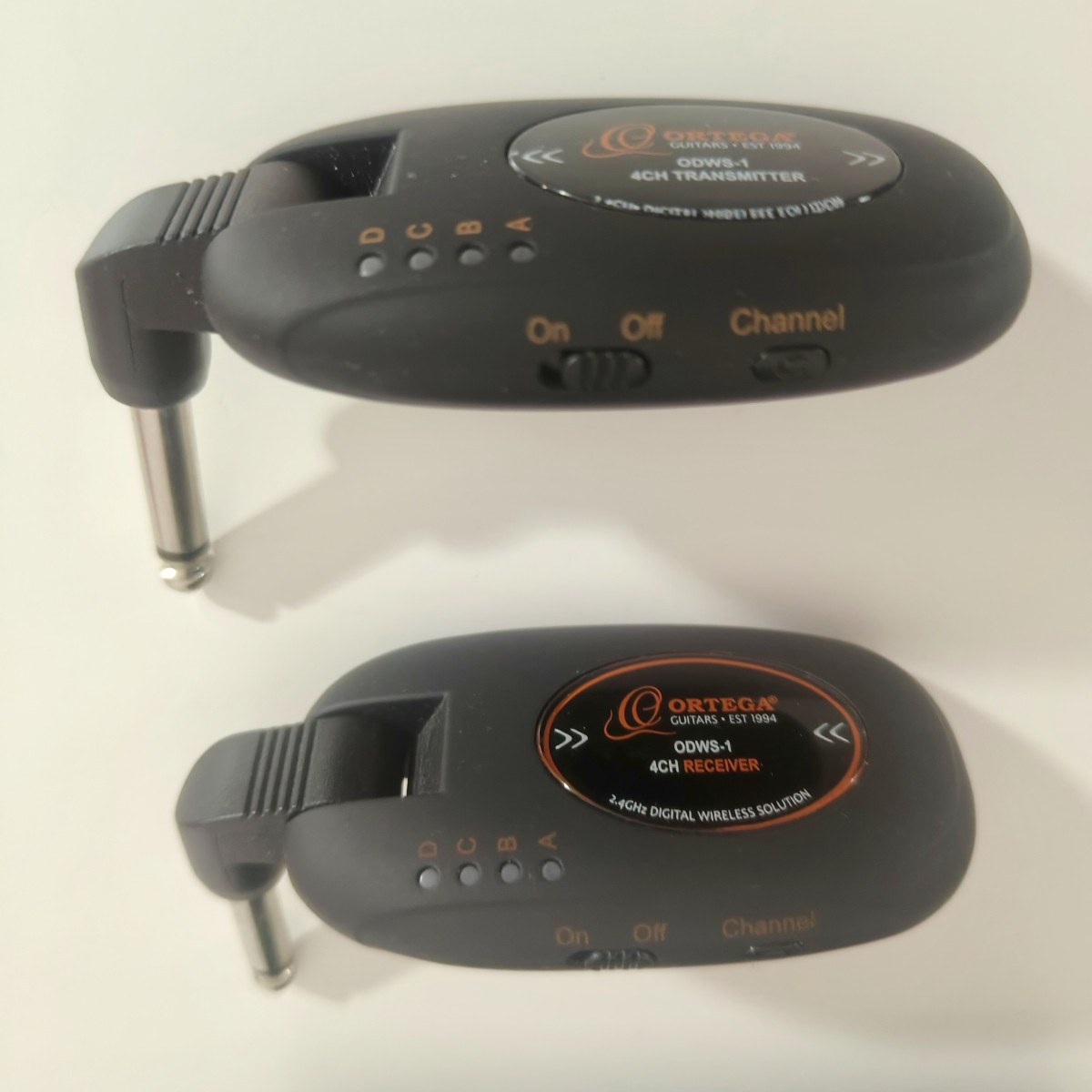 Sistema inalámbrico digital Ortega ODWS-1 para guitarra y bajo, en perfecto estado. Incluye un transmisor y un receptor.
