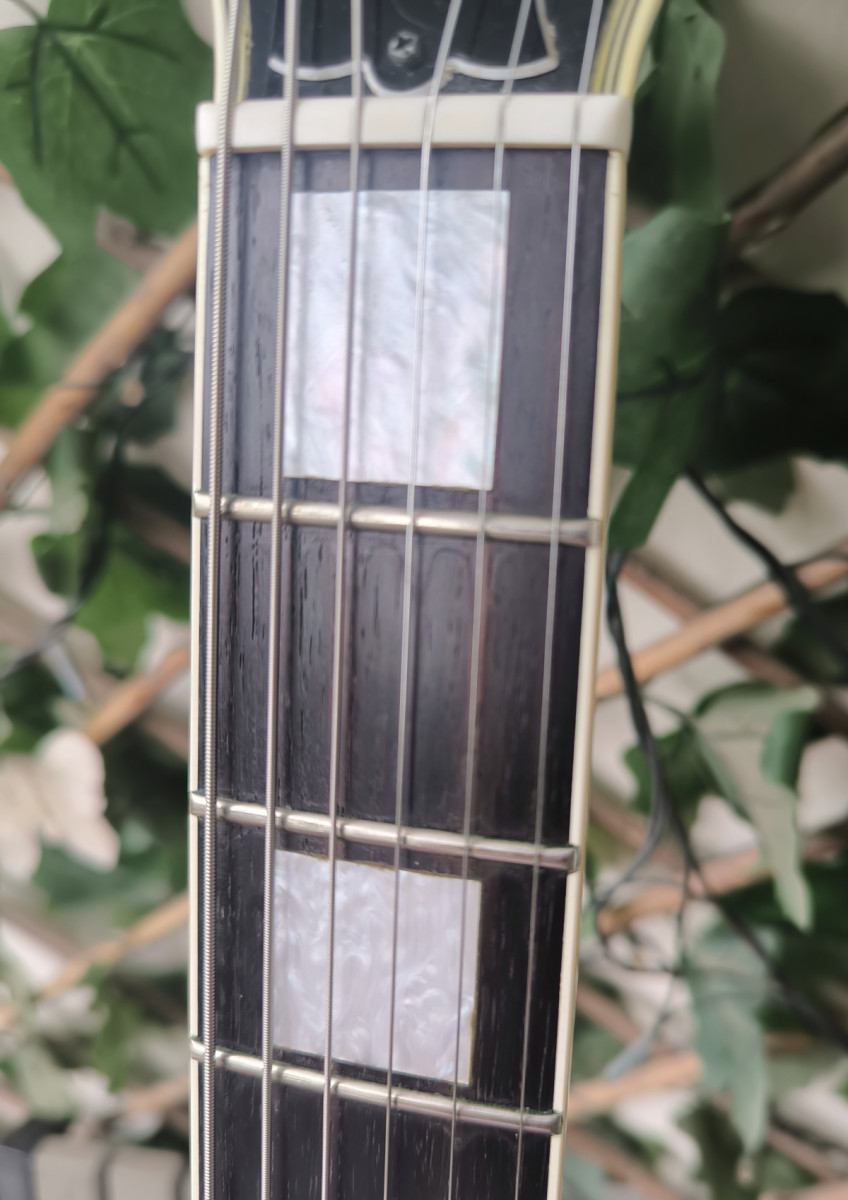 Esta concretamente fabricada en Terada, es una guitarra muy ochentera, con un perfil de mastil delgado, slim taper, y unas pastillas muy rockeras de gibson, las 490R y 498T, como las customs de la época.
