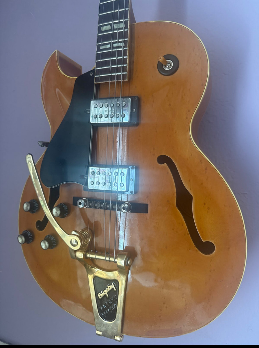 Impecable Guitarra de jazz muy rara para zurdos es tu oportunidad de poder disfrutar de una uno 75, sin tener que encargarla a la custom shop, fabricada a conciencia con los mejores materiales, tiene la trasera con ojo de pájaro y mástil caoba Pastillas Power Tron by TV Jones, puente gretsch, Bigsby dorado, clavijeros de bloqueo vintages gotoh, electrónica cambiada, potenciometeos y cableado jack todo cambiado. La fisura que se ve del mástil es una reparación pero no se partió solo tapar grieta y reforzarla por un luthier profesional, suena y se ve increíble .