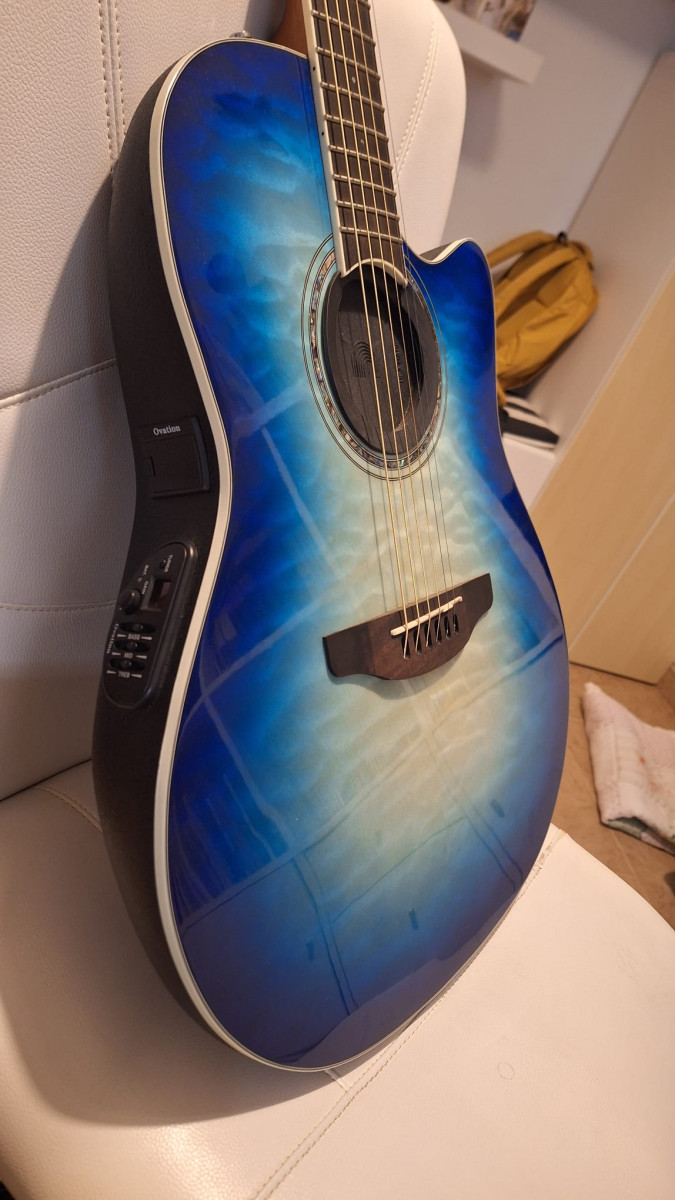 Guitarra acústica Ovation electrificada Serie Celebrity Std Plus CS28P-RG Regal to Natural con un llamativo acabado degradado en tonos azules y blancos. Impecable, como nueva. Regalo el tapa boca que trae para evitar acoples. No cambios, necesito el dinero