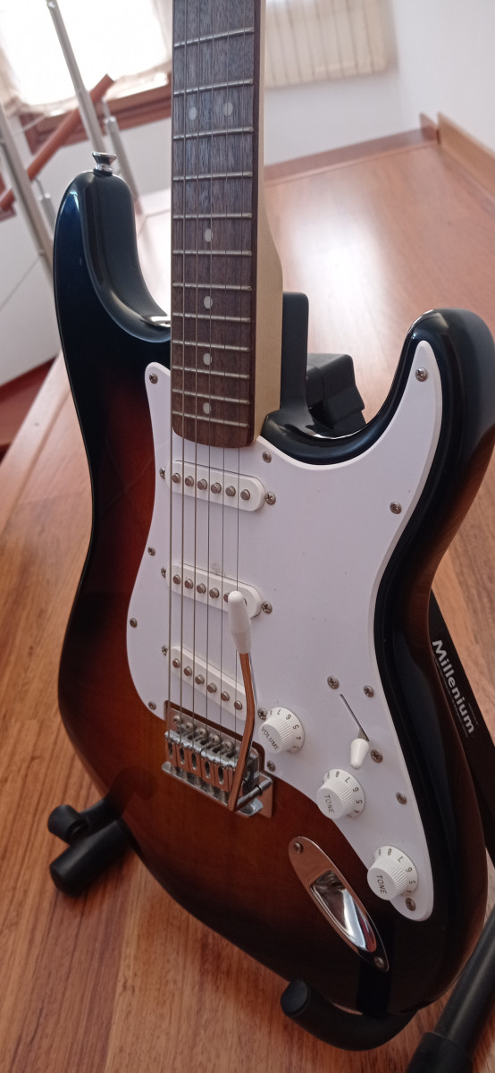 Guitarra eléctrica Squier Stratocaster acabado Tobacco Sunburst hecha en Indonesia, más funda y correa. Cómo nueva, sin marcas de uso, señales, roces, trastes 100%., como salida de tienda (aún conserva plásticos protectores en tapas de clavijas de clavijero y mástil). Más fotos de detalle y vídeos de estado y sonido por WhatsApp. Perfecto para iniciarse con la garantía de tener una guitarra que cumplirá durante mucho tiempo. Hago envío o entrega en mano en Iniesta, Albacete, Valencia.
