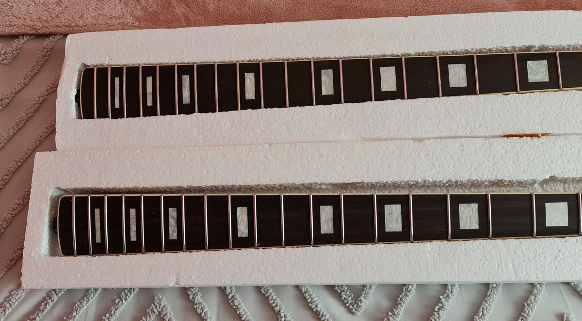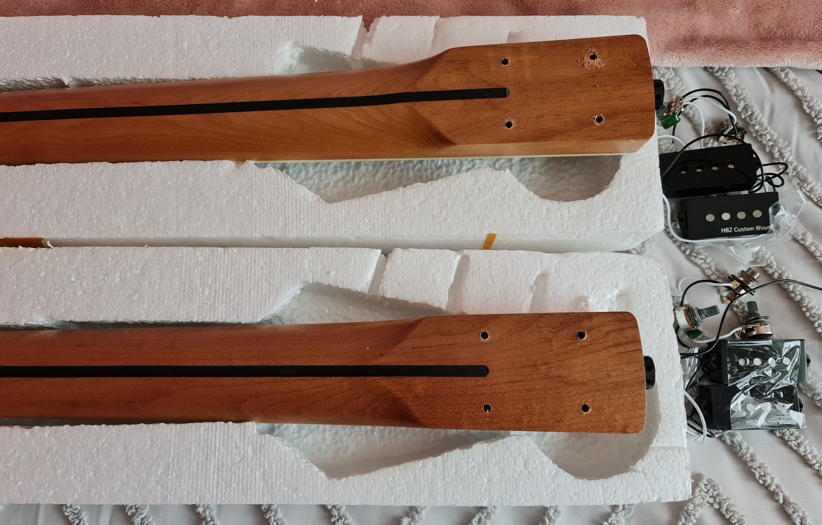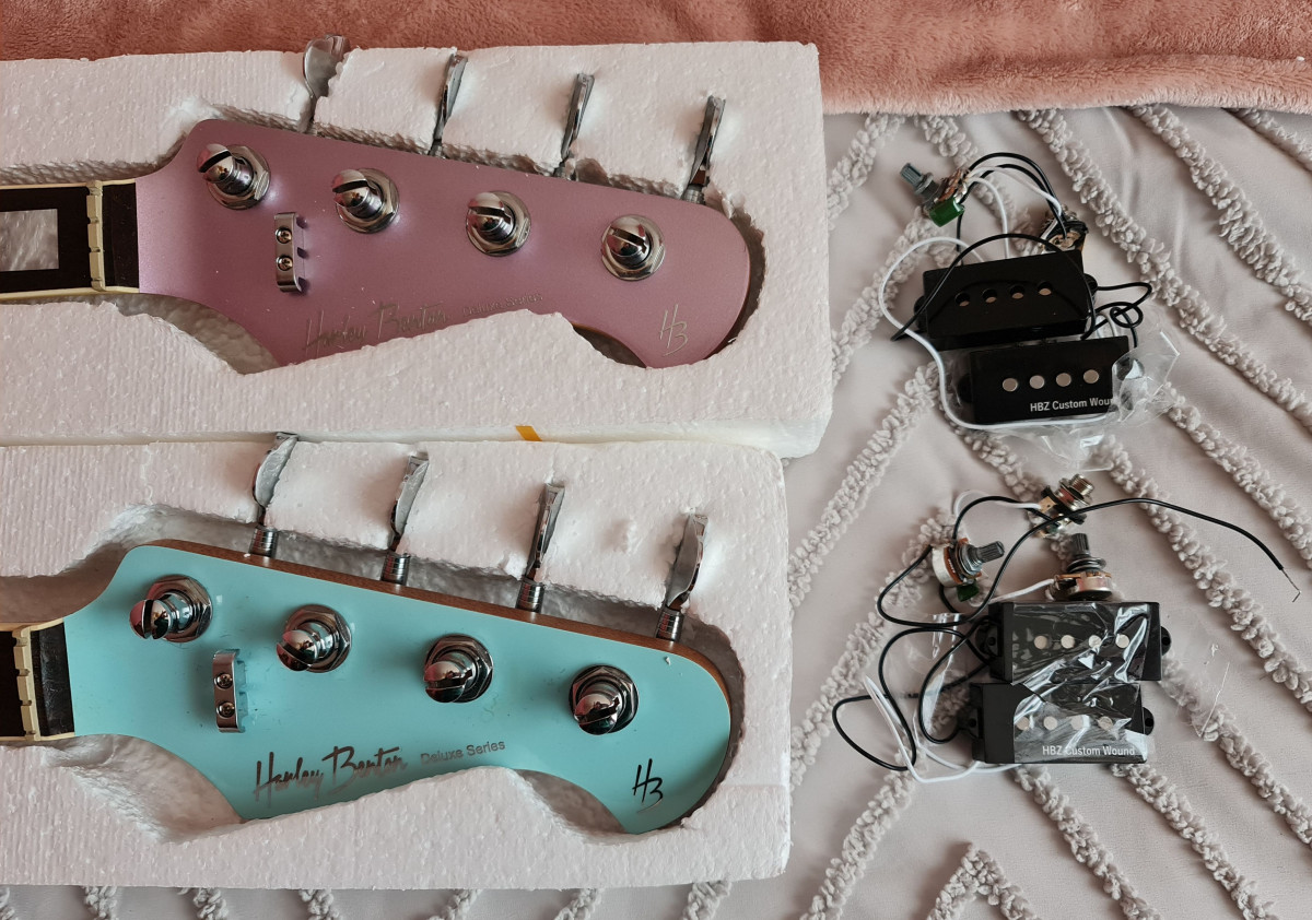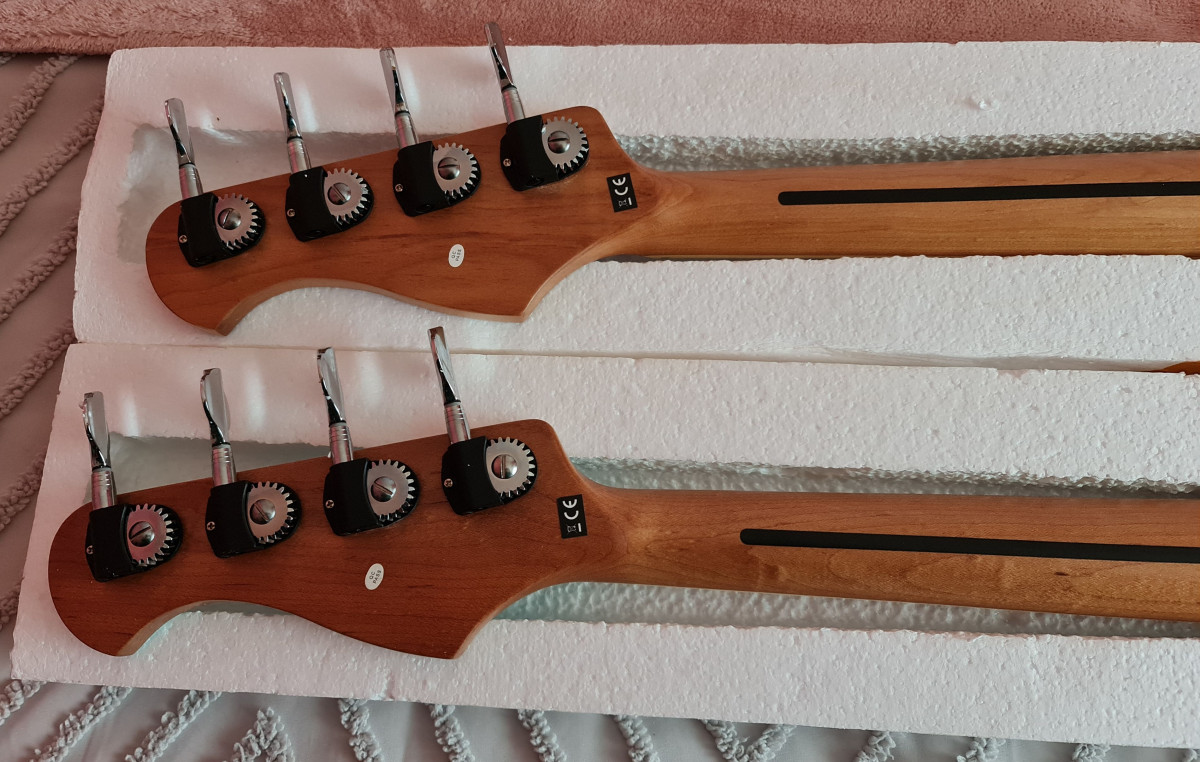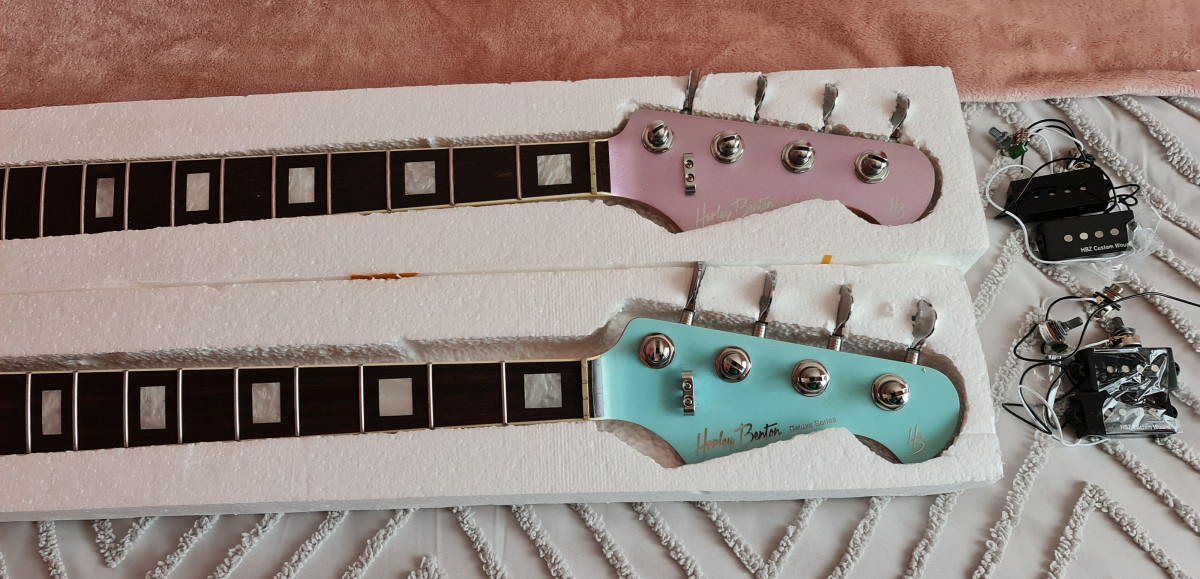 -Mástiles completos de dos Harley Benton MV-4P (un Daphne Blue y un Burgundy Mist), los Precision más altos de gama del fabricante. Llevan acceso al alma por el talón para mayor comodidad de ajuste.