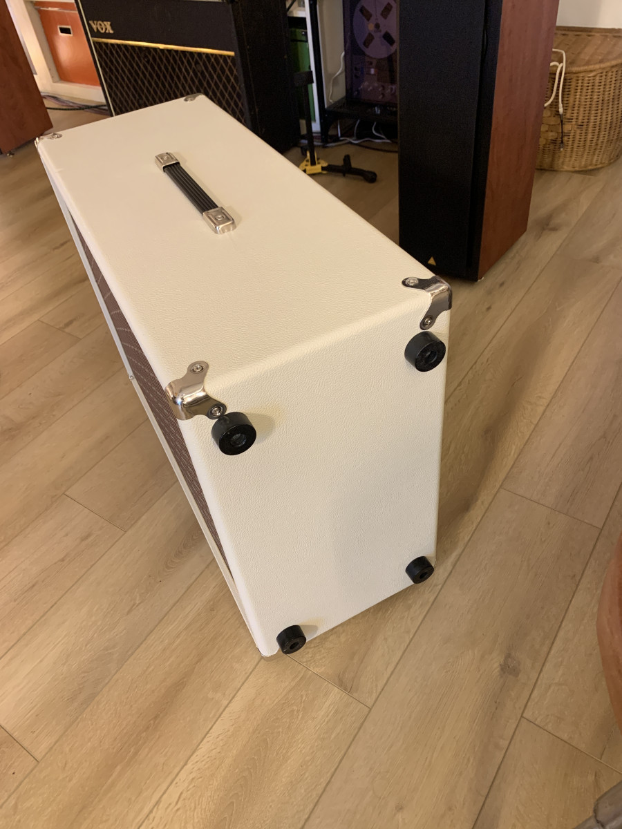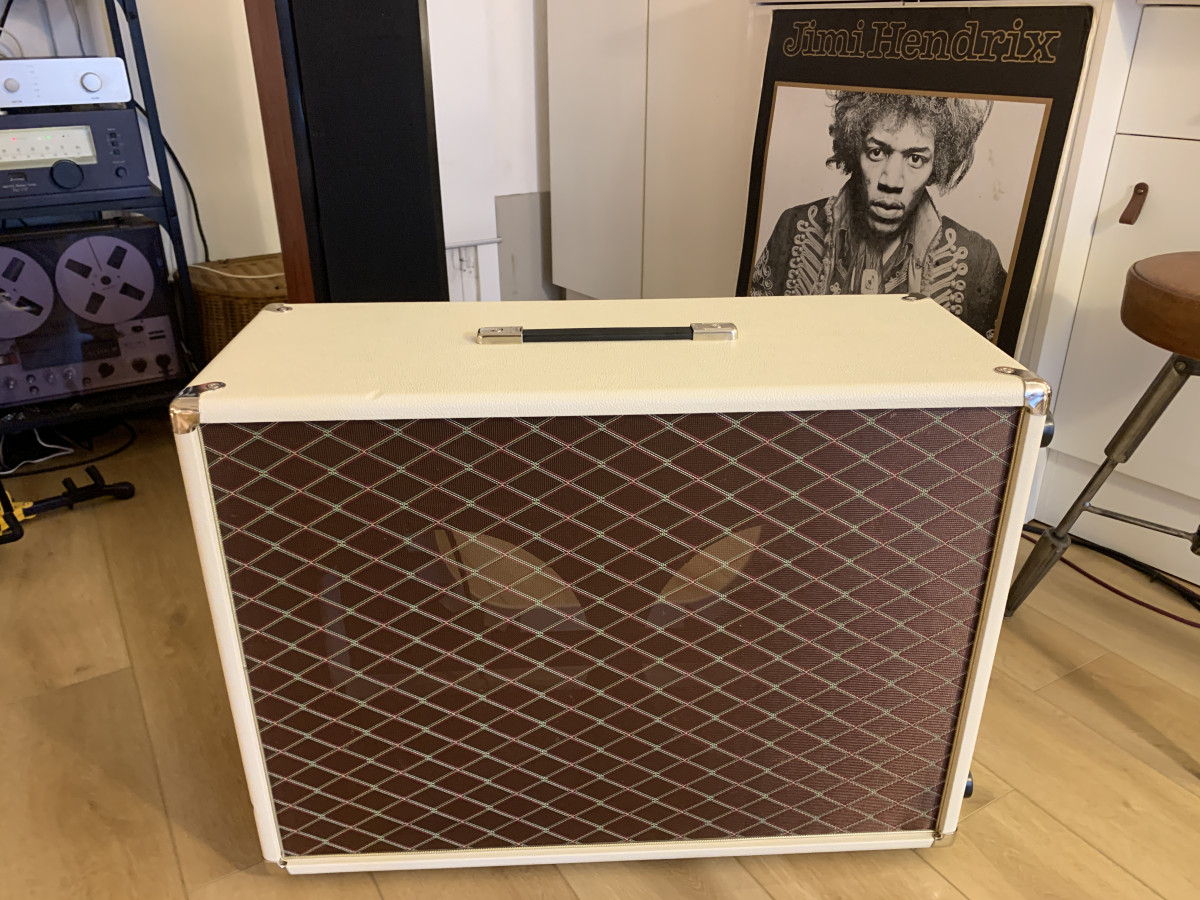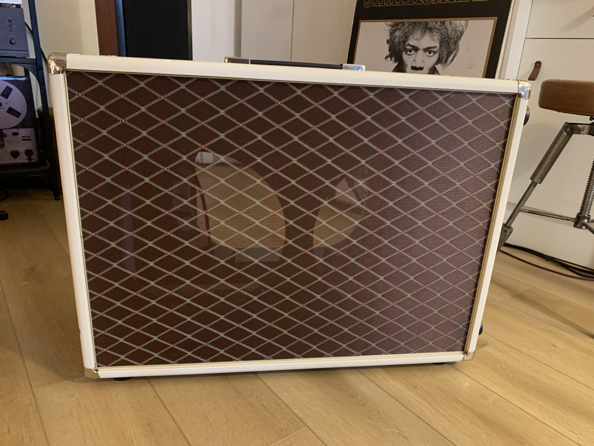 Vendo un magnífico bafle Dumble de 2x12" fabricado por Tube Town en color crema (arena), con frontal marrón Vox Style Diamond y ribetes dorados. Está como nuevo, con solo unas mínimas señales de uso.