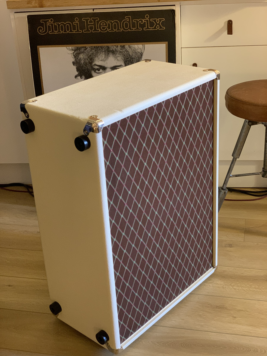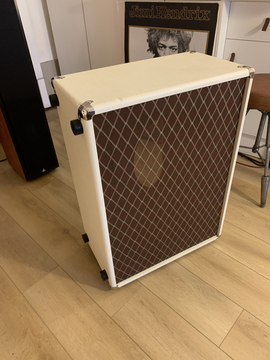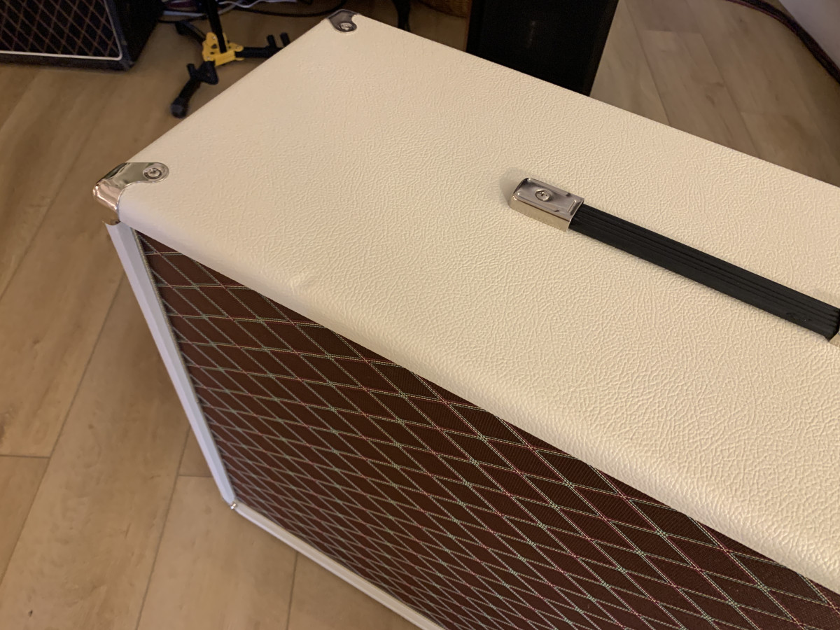 Vendo un magnífico bafle Dumble de 2x12" fabricado por Tube Town en color crema (arena), con frontal marrón Vox Style Diamond y ribetes dorados. Está como nuevo, con solo unas mínimas señales de uso.