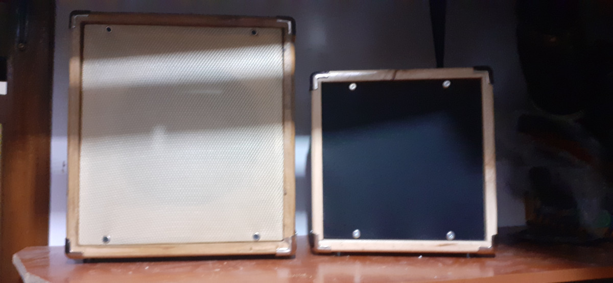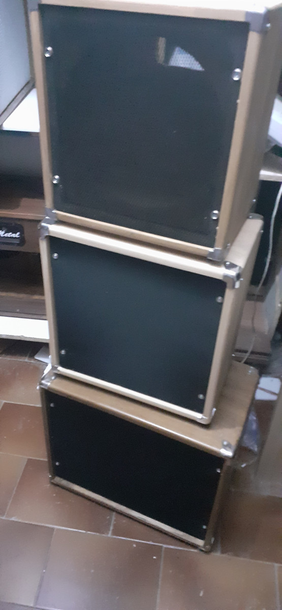 Pantalla artesanal en madera de Abeto finlandes 18mm acabado barnizada natural, tela acústica negra, cantoneras metálicas asa retráctil, tacos de goma negra y copela metálica con entrada de jack, de reducidas dimensiones:28×29×16 monta altavoz Eminence Beta USA Vintage de 100w 8ohmios. Ideal para amplificadores pequeños Orange Micro-terror y similares.