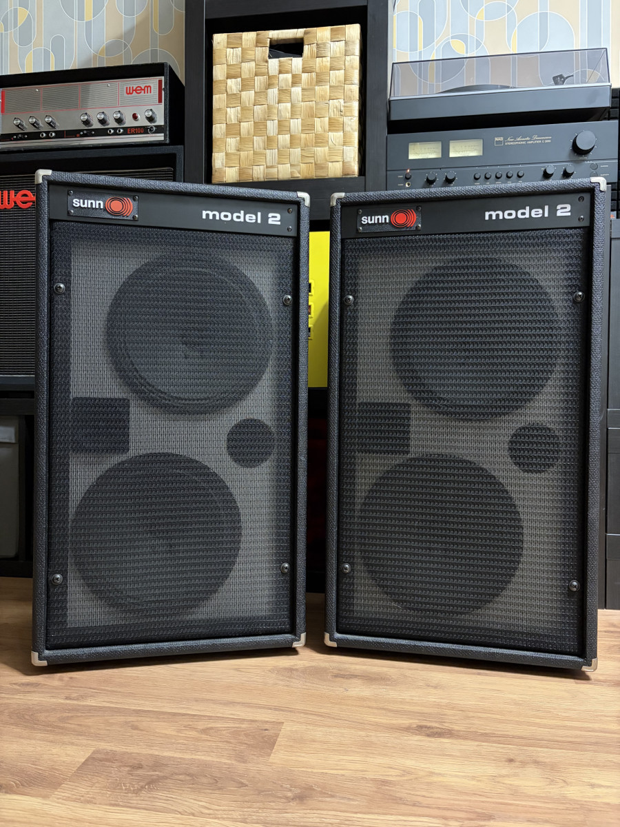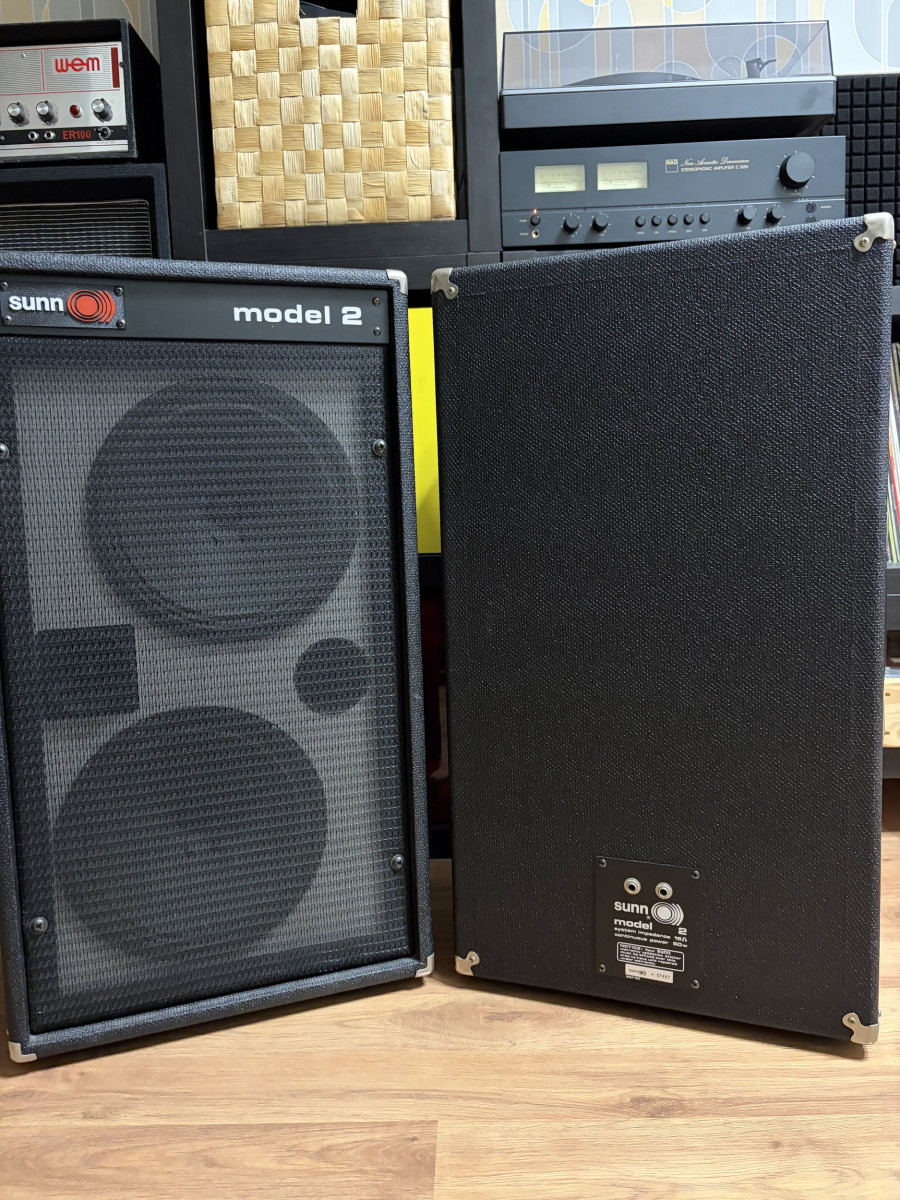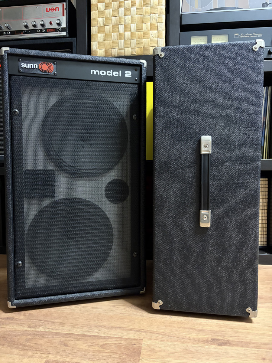 Vendo pareja pantallas Sunn Model 2. Sunn o))) 2x10”. Finales de los años 70, made in usa, cada pantalla lleva dos conos originales de la época Eminence Squareback de 10” y un tweeter Motorola. Todo original, apenas marcas de uso, muy bien conservadas. Suenan muy bien con guitarra, bajo, teclado, p.a. Ideal para pequeños bolos, estudios, o para decorar tu salón y tocar en tu casa con un cabezal a juego o escuchar música con un equipo vintage. Prefiero vender juntas, 250€ cada una. La pareja 400€. Se pueden ver y probar en Rivas-vaciamadrid (Madrid).