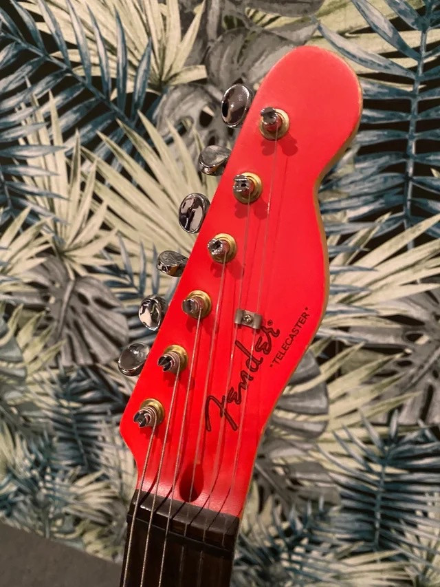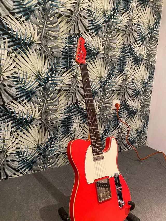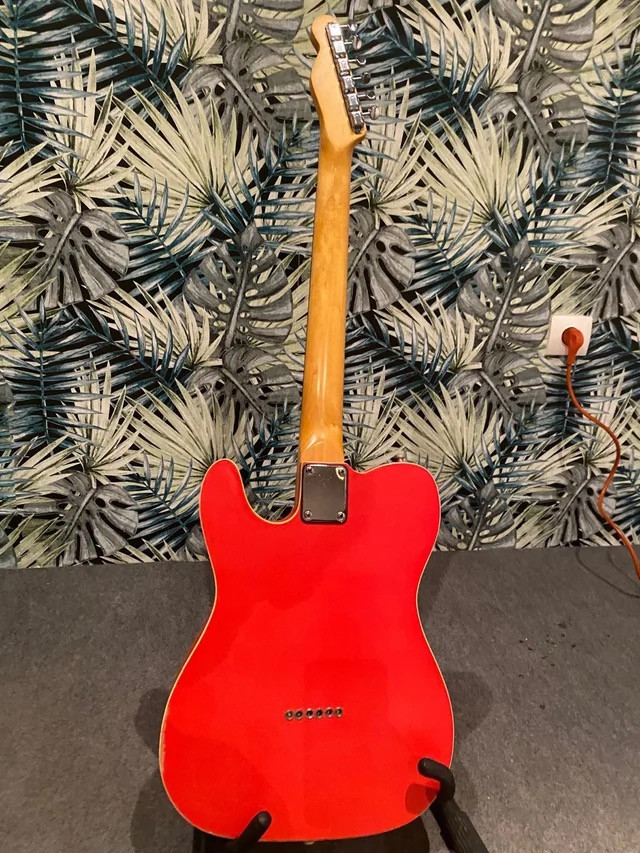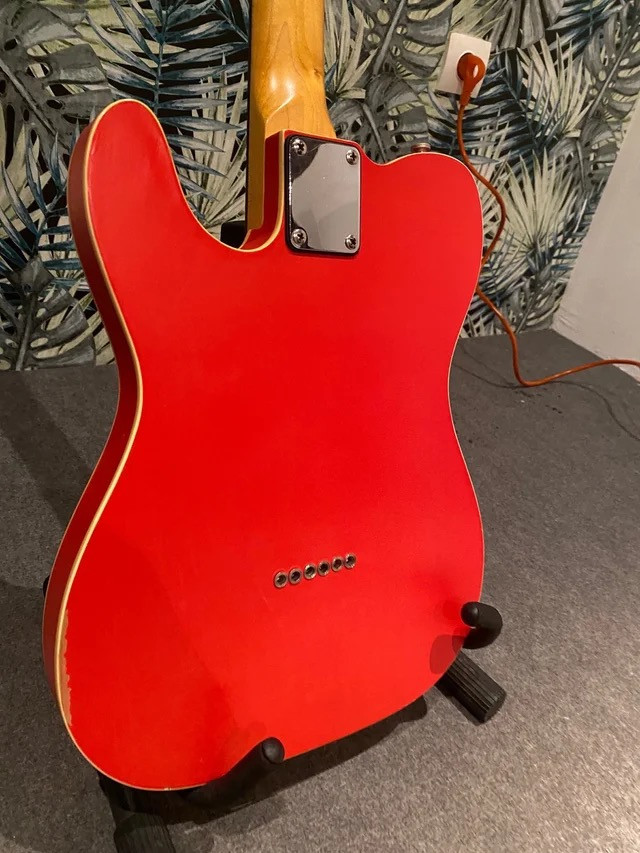 Telecaster montada con piezas de calidad, lacada a nitro a poro abierto en Torino Red con doble binding crema, y matching headstock con la pala del mismo color.