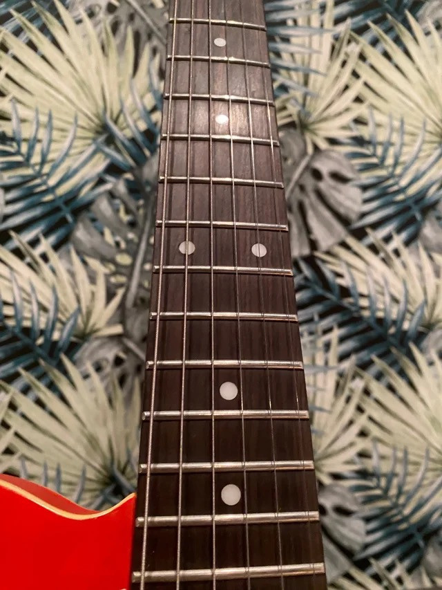 El mástil de arce canadiense y diapasón de palorrosa también relicado a nitro, con cejuela de grafito. Trastes medium jumbo 10/10 a estrenar.