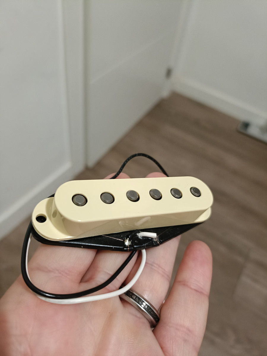 Le ha cambiado porque soy de sonidos más heavys, simplemente, la pastilla suena estupendamente, salida media (o quizá media, media alta) con un tono acampanado muy muy bonito, muy lleno, profundo, muy dulce. Me dio pena poner una pastilla de más ganancia porque pierdo ese tono a stratocaster, pero para los estilos solistas que yo hago, se me quedaba un poco corta de gain, los heavys somos así.