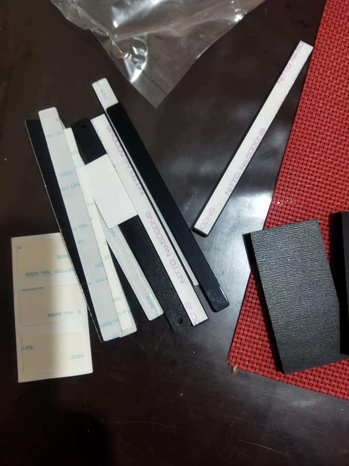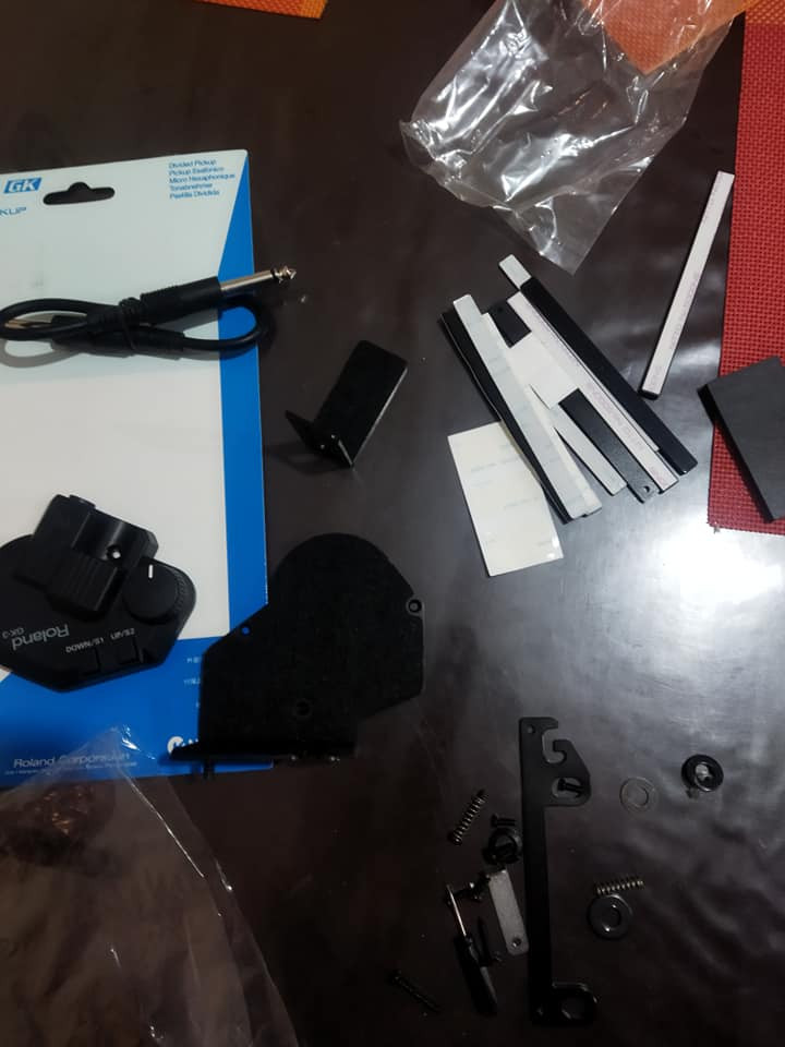 Varios accesorios de instalación incluidos; cinta adhesiva de doble cara, almohadillas, espaciadores, y placa para conectar guitarras tipo Les Paul.