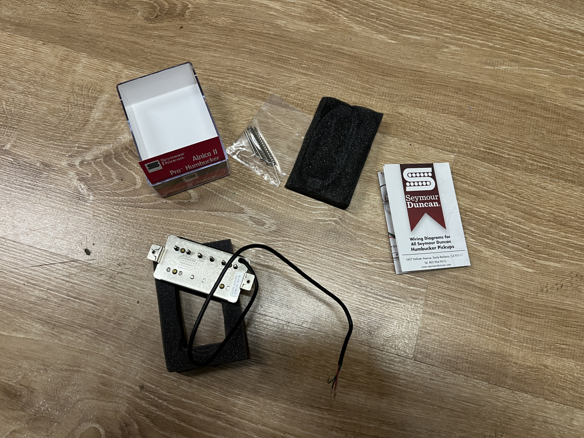 Pastilla humbucker Seymour Duncan Alnico II Pro totalmente nueva, nunca instalada. Incluye todos sus accesorios, papelotes tornillos y muelles. Recreación de SD de la mitica pastilla PAF de Gibson. Está pensada para mastil pero puedes ponerla en el puente perfectamente!