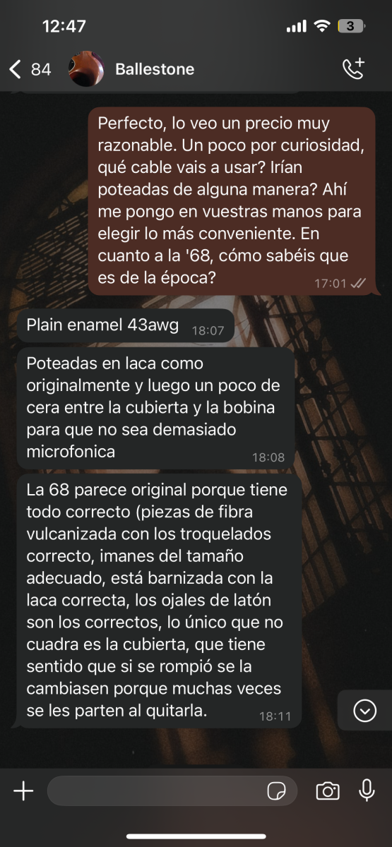 La pastilla llegó en una partscaster hecha seguramente en los 70-80 con restos de una teleca del 68 y un cuerpo artesanal bastante cutre. (adjunto fotos de las piezas originales). La pastilla había sido rebobinada de aquella manera, con cubierta y cables no originales de manera que lo que queda del 68 son los imanes y la bobina.