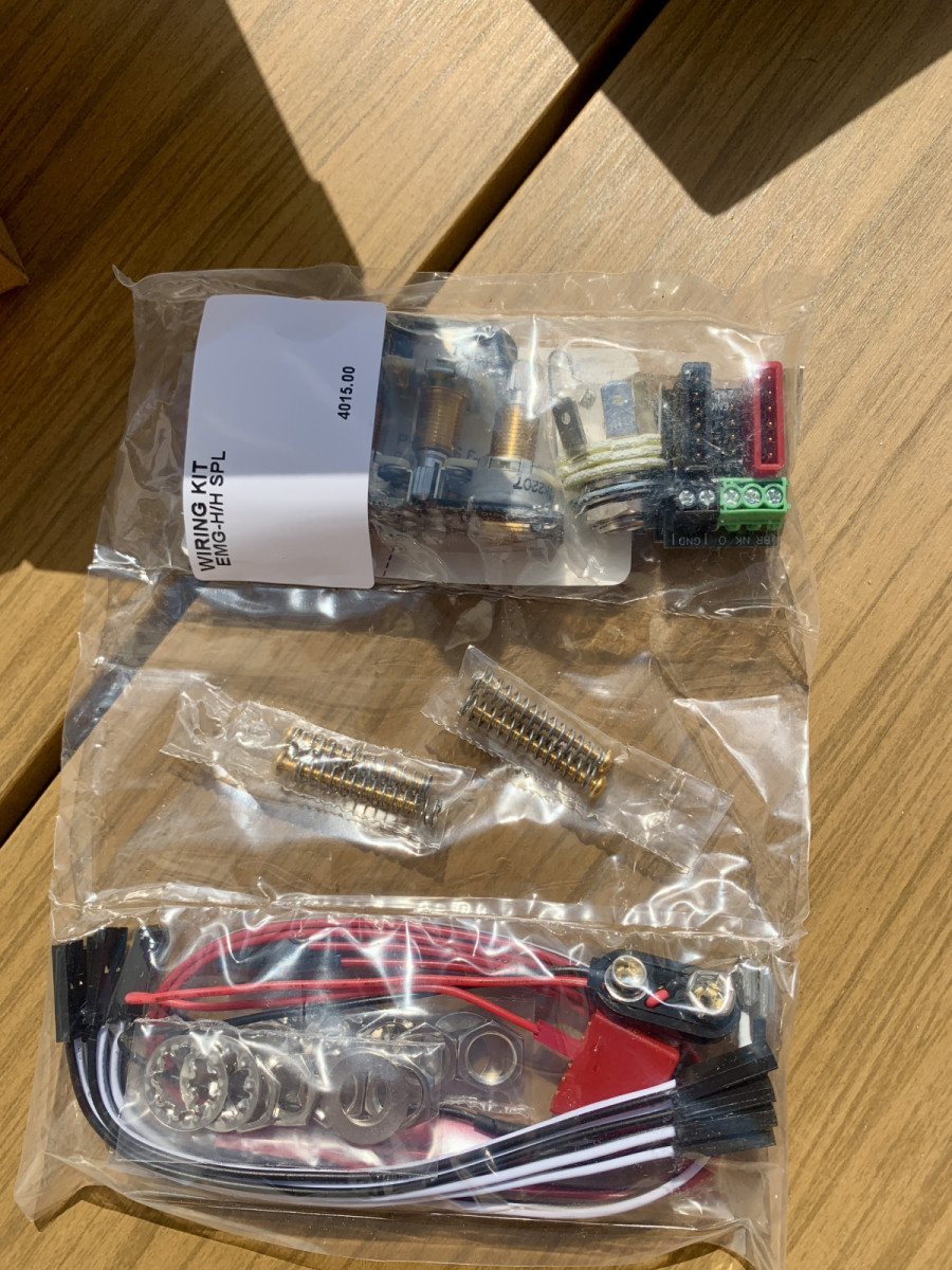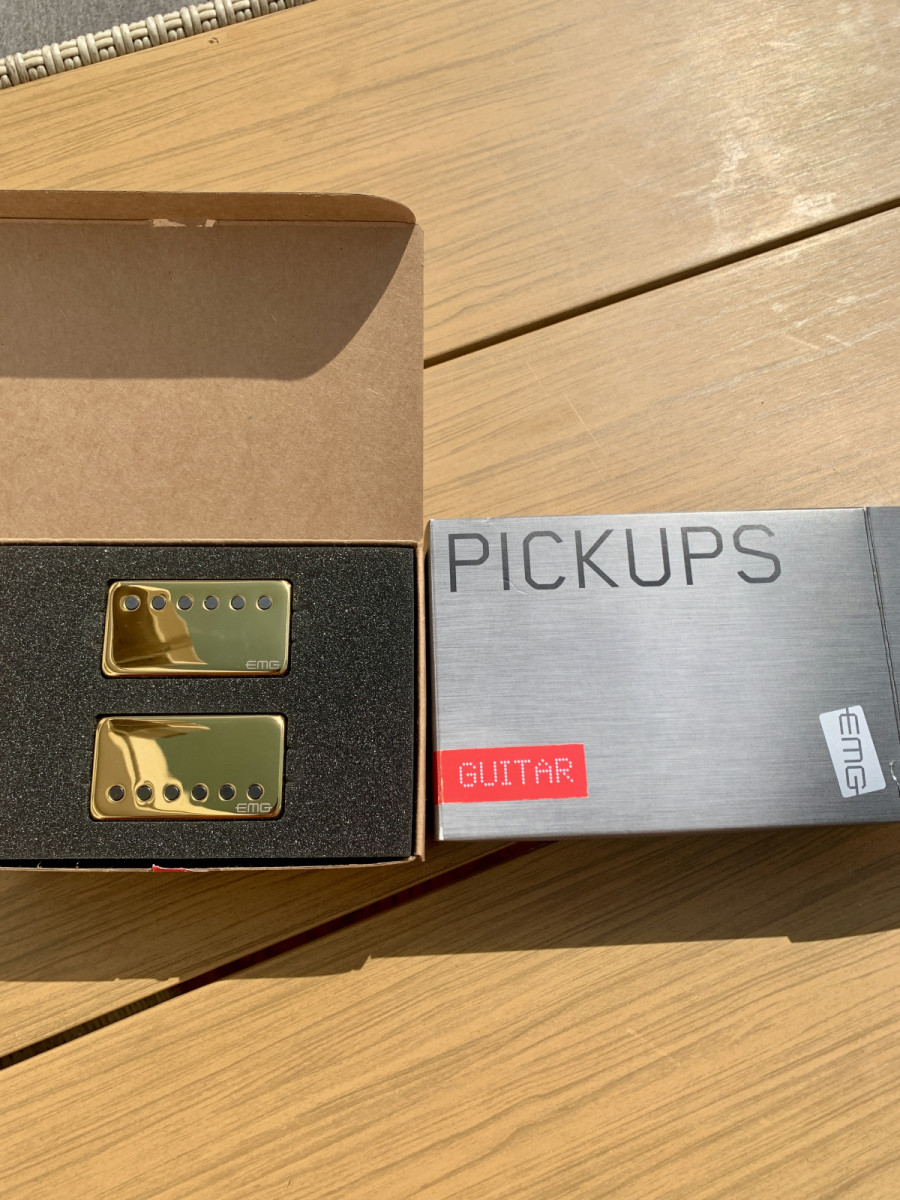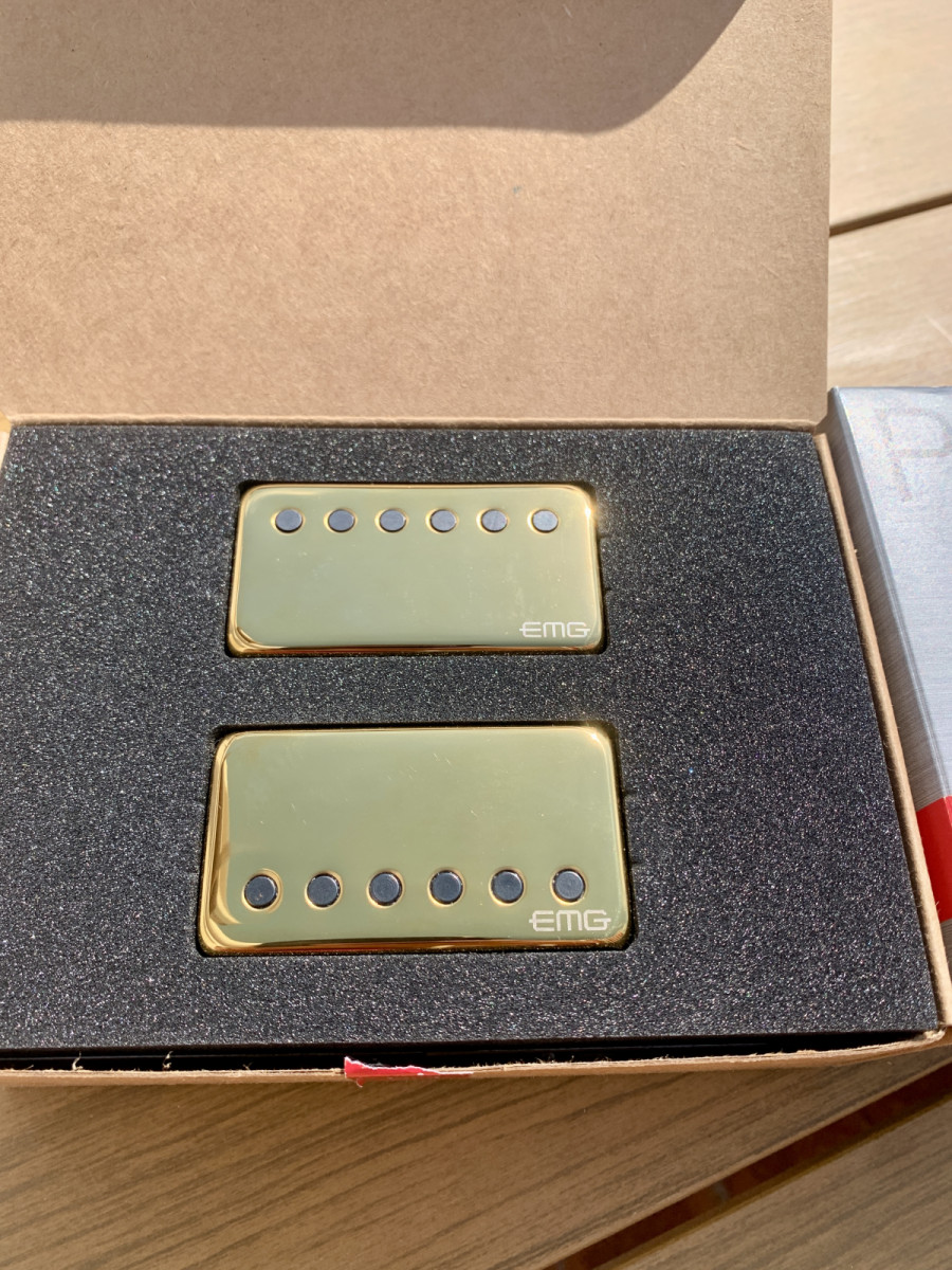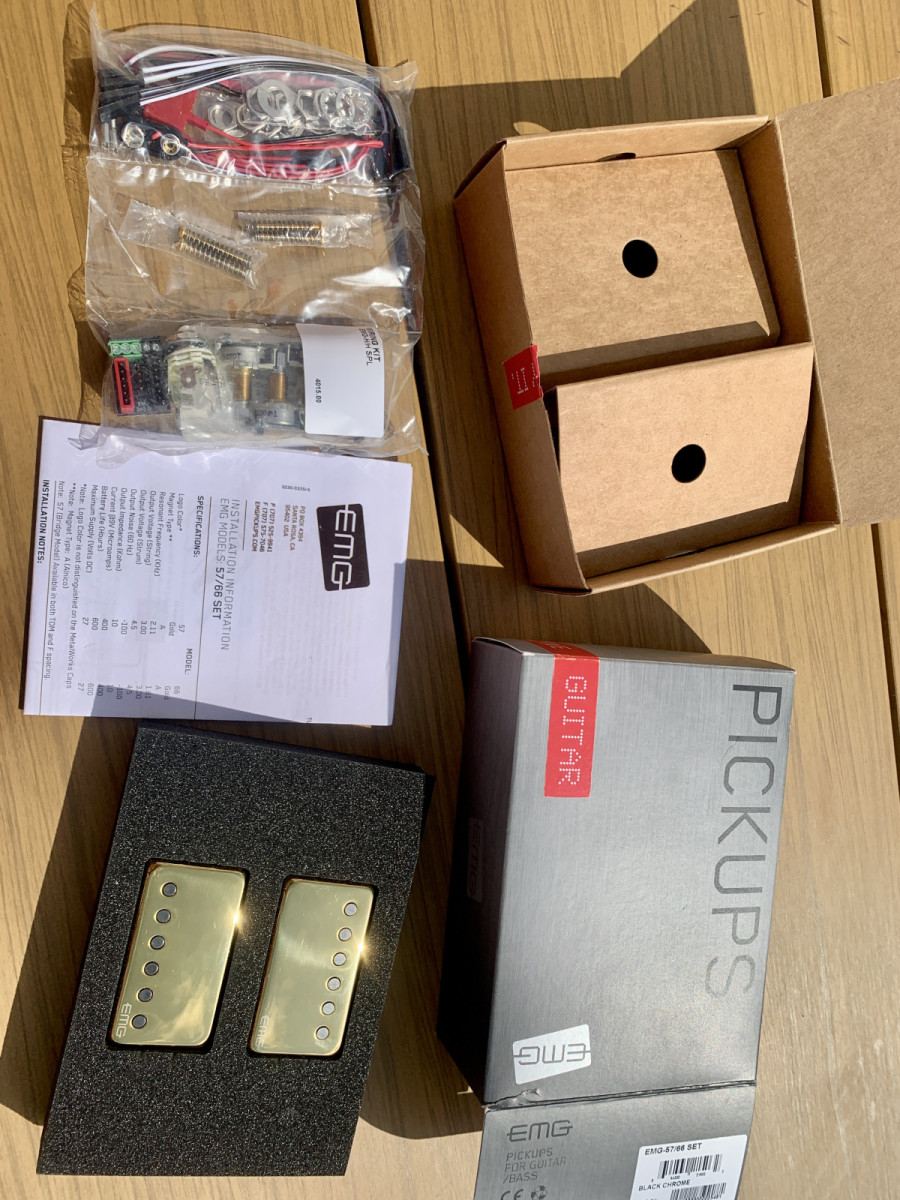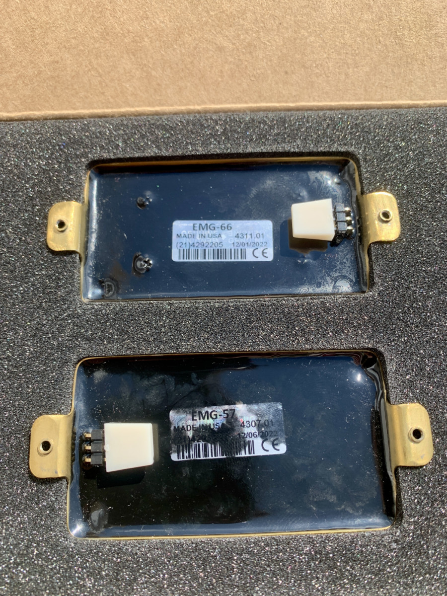 Juego de pastillas humbucker EMG 57/66 Gold en perfecto estado con todos los accesorios, cables y potenciómetros.