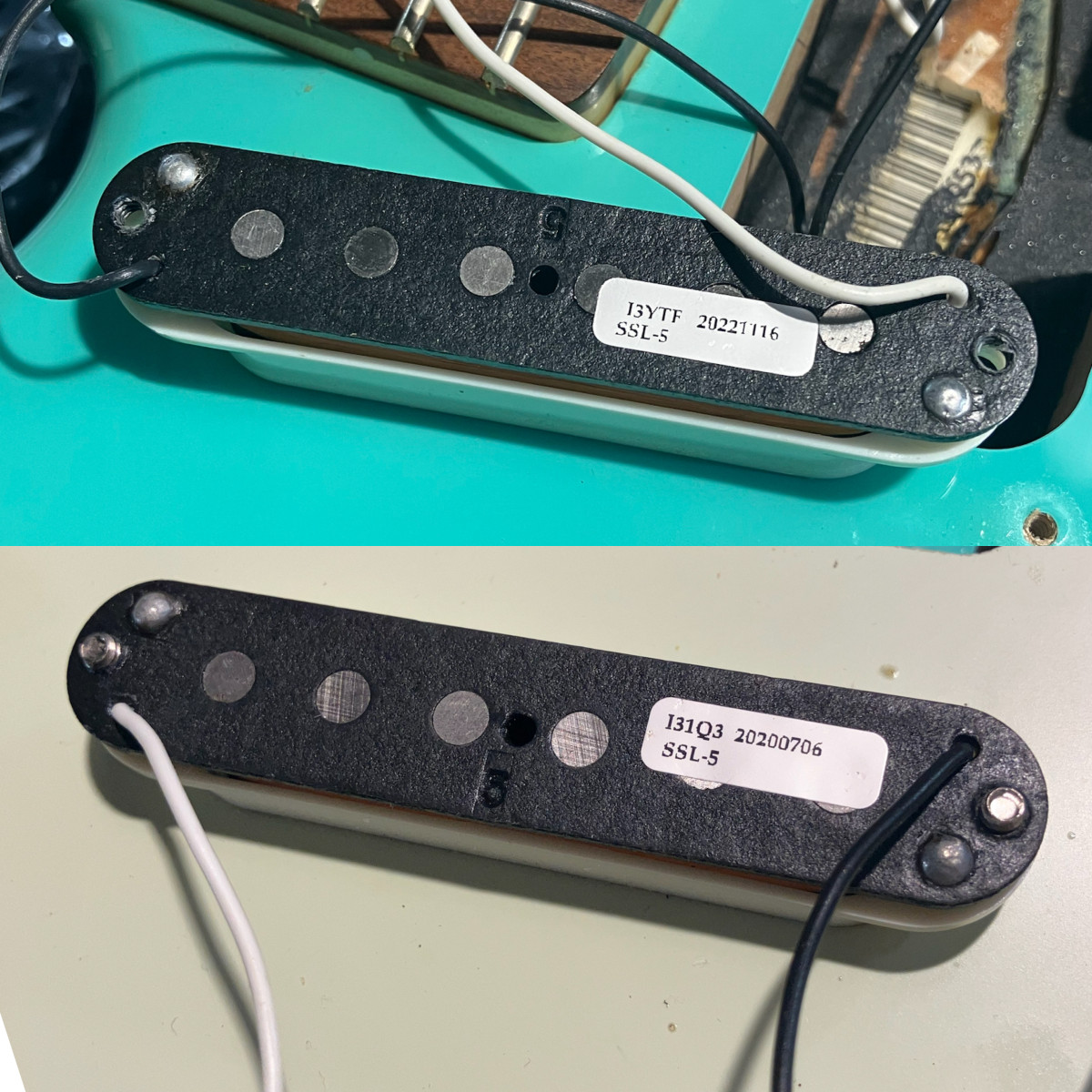 Tienen 13,42k la normal, que iría en posición de mástil o puente y 13,54k la que tiene el bobinado inverso, que sería para centro, aunque cualquiera de las dos se pueden colocar en cualquier posición según como se coloquen lo cables, como indica la marca. Incluyen cubiertas Fender blanco y crema.