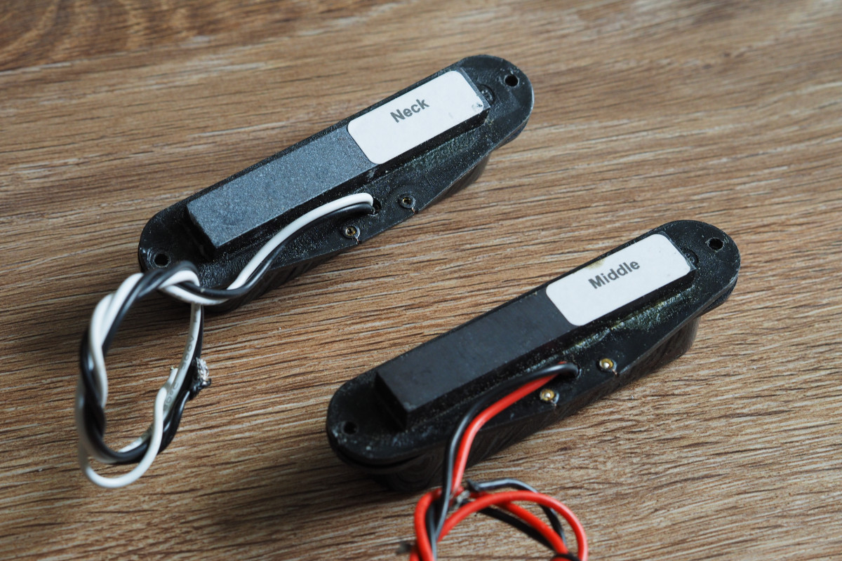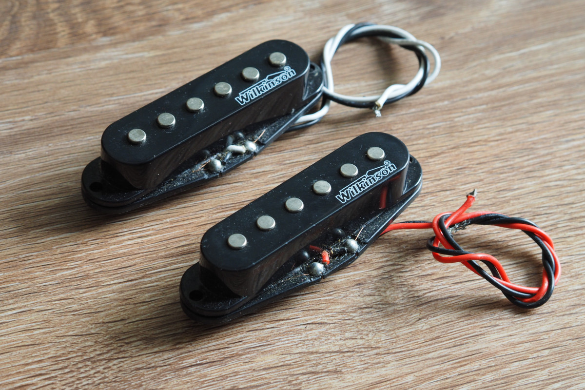 Desmontadas de una guitarra que usé para un proyecto, juego de dos pastillas simples cerámicas Wilkinson MWHS 'HOT'. Posición de cuello y medio (reversed). 24cm de cable aproximadamente. Mucha salida y buen sonido. DC 6.09 y 5.8K respectivamente.