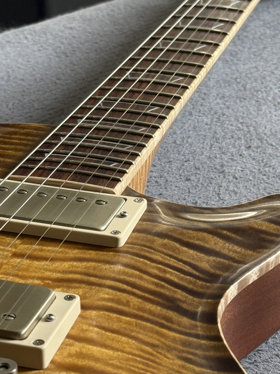 Cuerpo de caoba de honduras y mástil de arce flameado que quita el sentido. La tapa es quilted tubular, de un nivel altísimo, y acabada en un color que le queda como un guante.