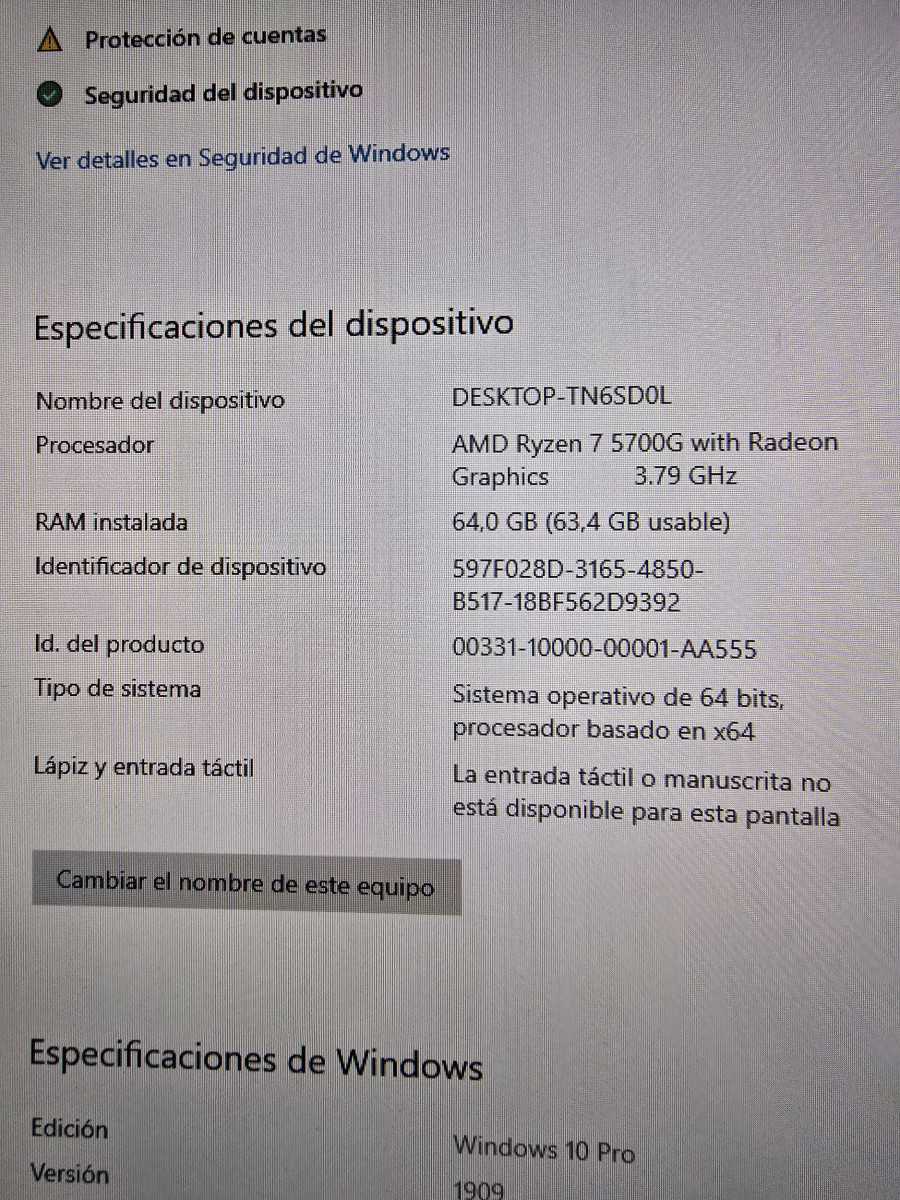 ⁃ Sistema Operativo: Windows 10 Pro (Versión 1909)