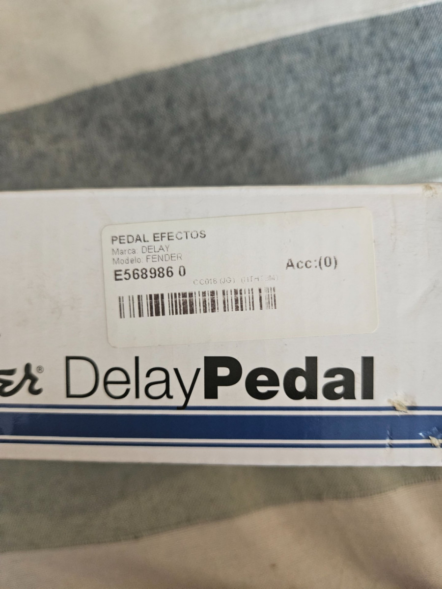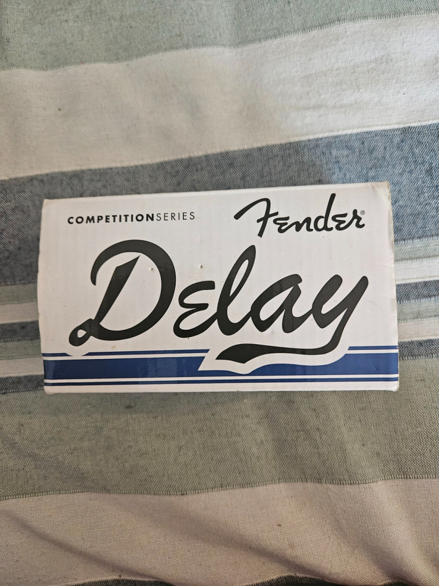 Pedal de efectos Fender Delay para guitarra. Diseño clásico con acabado blanco y detalles en azul.