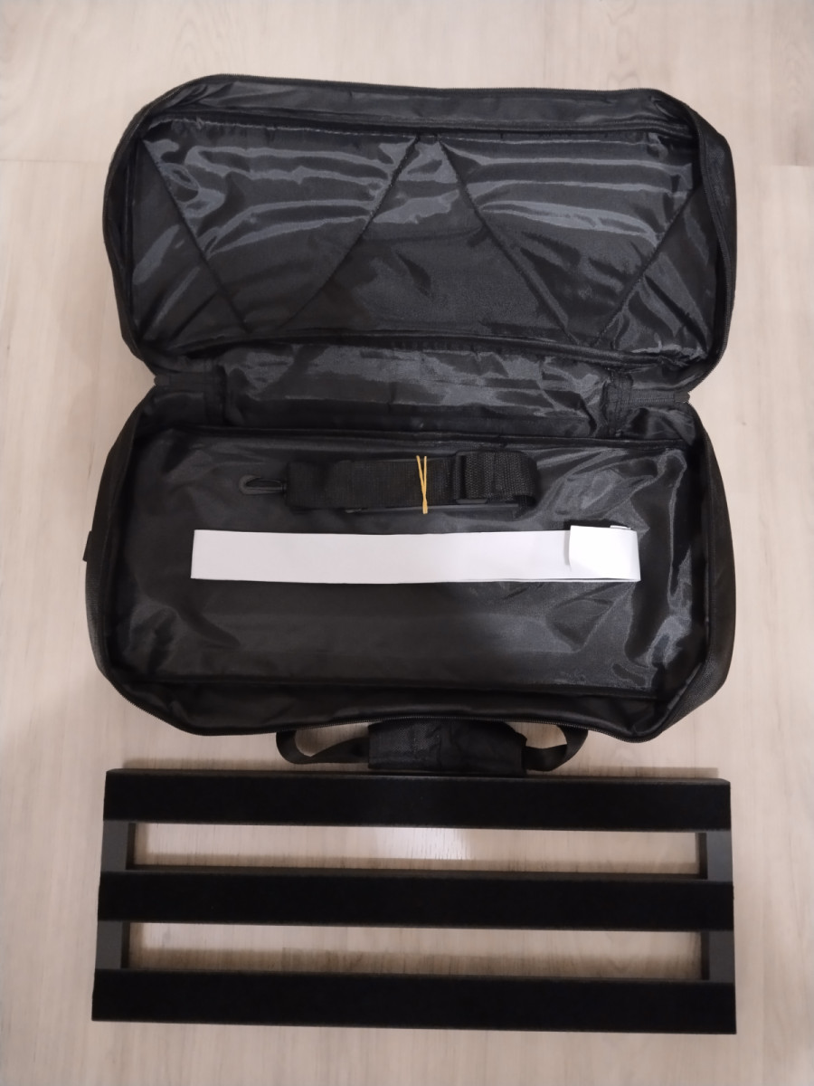 - Pedalboard metálica con bolsa de transporte con bandolera y velcro para más pedales.