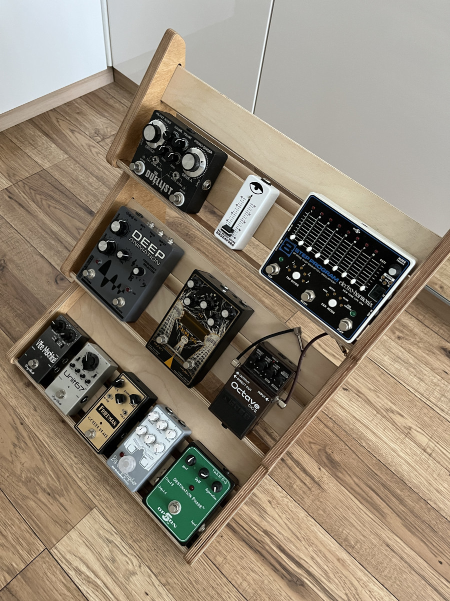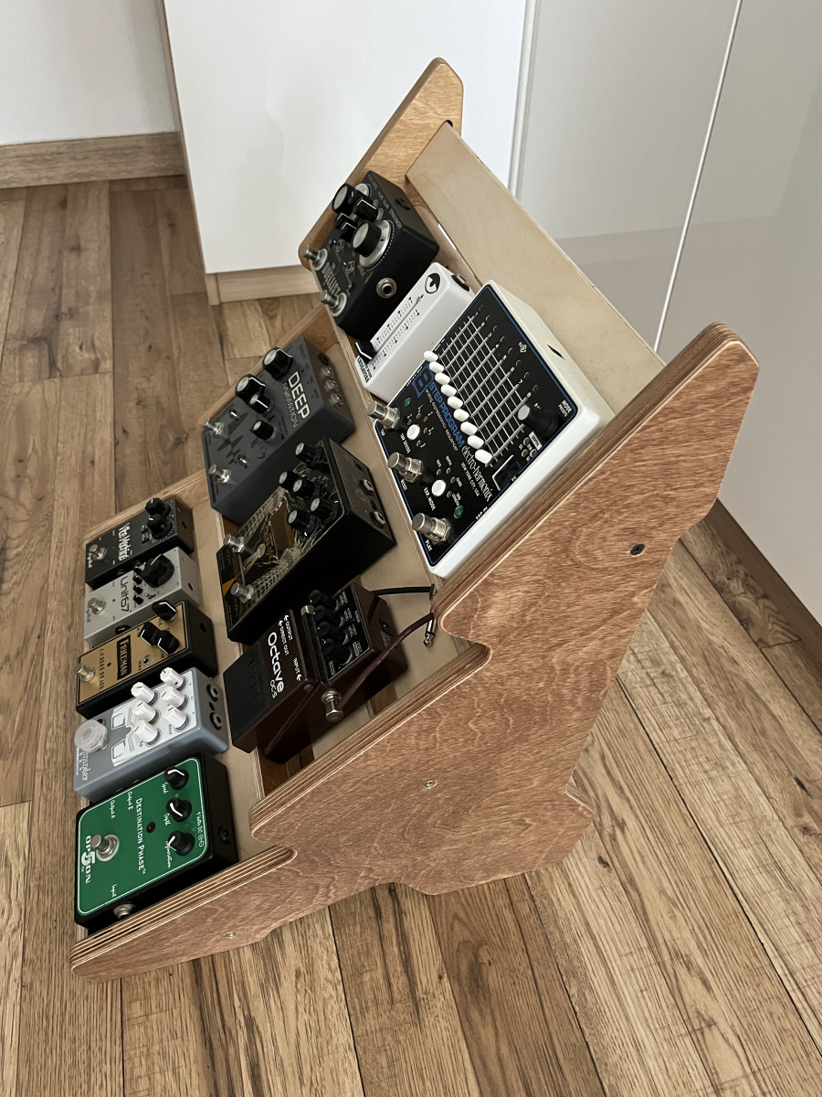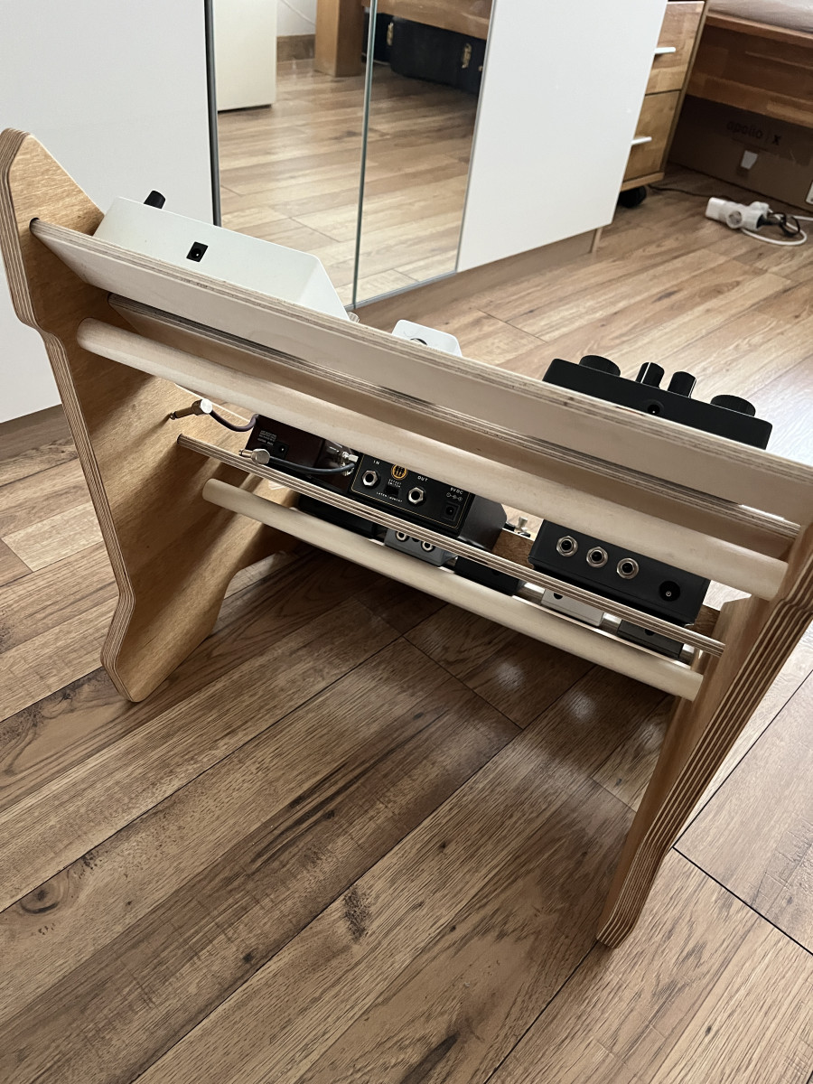 Pedalera de escritorio de 3 niveles en madera, de la marca Synth Toys, comprada en Etsy. Su precio nueva supera los 200 € con el envío. La adquirí hace un par de meses y está en estado impecable, no ha salido del estudio. Únicamente la vendo porque necesito un modelo de mayor tamaño para poder poner más pedales.