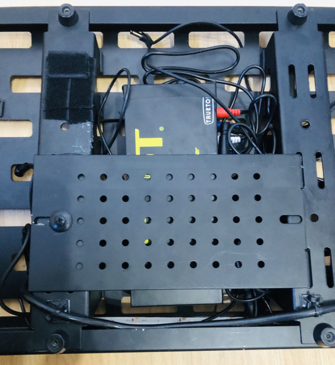 Puedes alimentar más de 20 pedales sin un solo ruido gracias al transformador toroidal que lleva la fuente. No la vendo por separado porque está adaptada al fundo de la pelarla con el Rockboard the tray y una luz led azul muy bonita. Además lleva instalado el Rockboard mod 3 que te permite in y out desde el mismo sitio más salidas xlr por si usas un modelador.