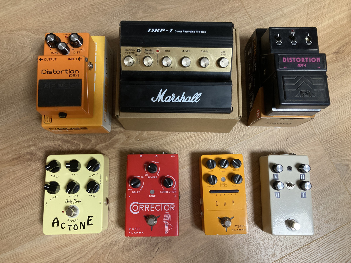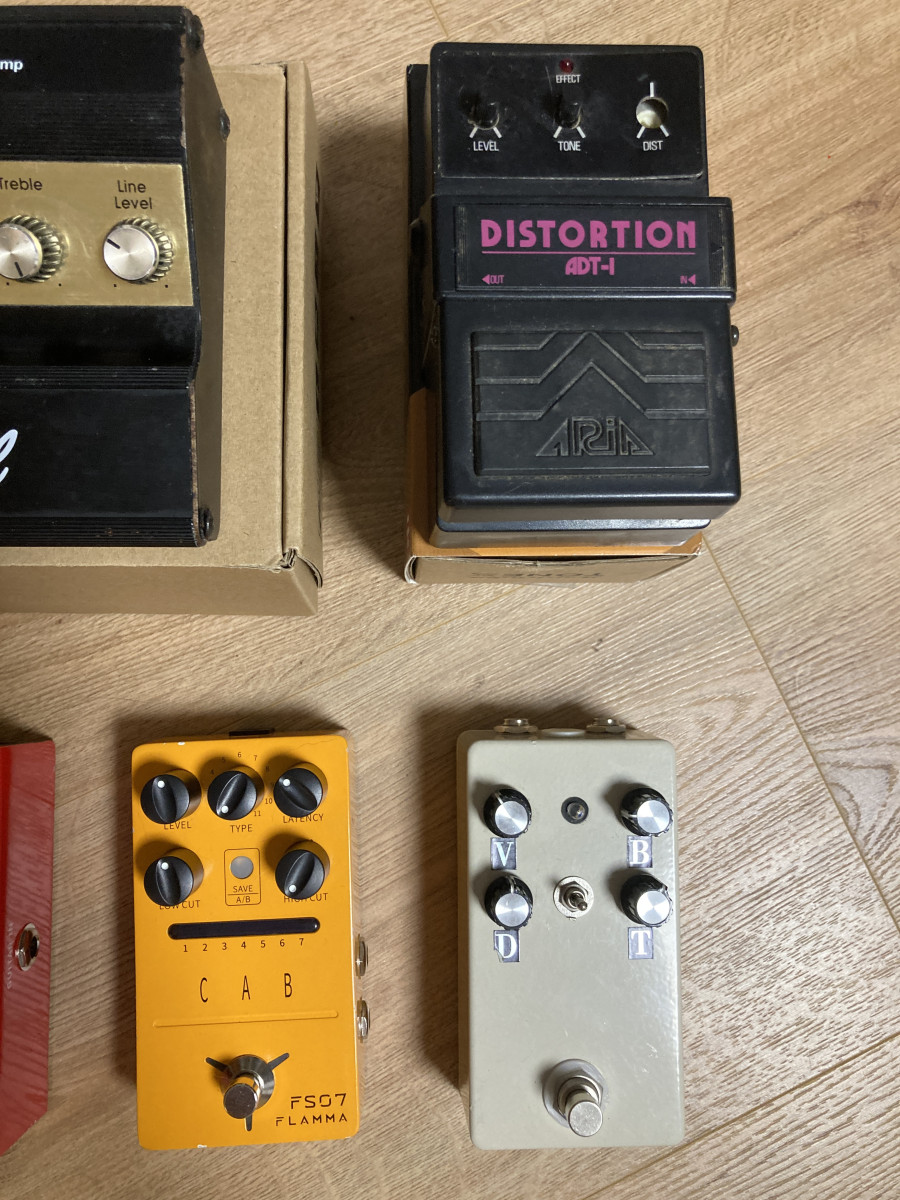 - ARIA ADT-1 Distortion - Otro pedal que me encontré por ahí en un cajón. Tiene un pote sin patilla. Ed distorsión con un punto de fuzz al final.