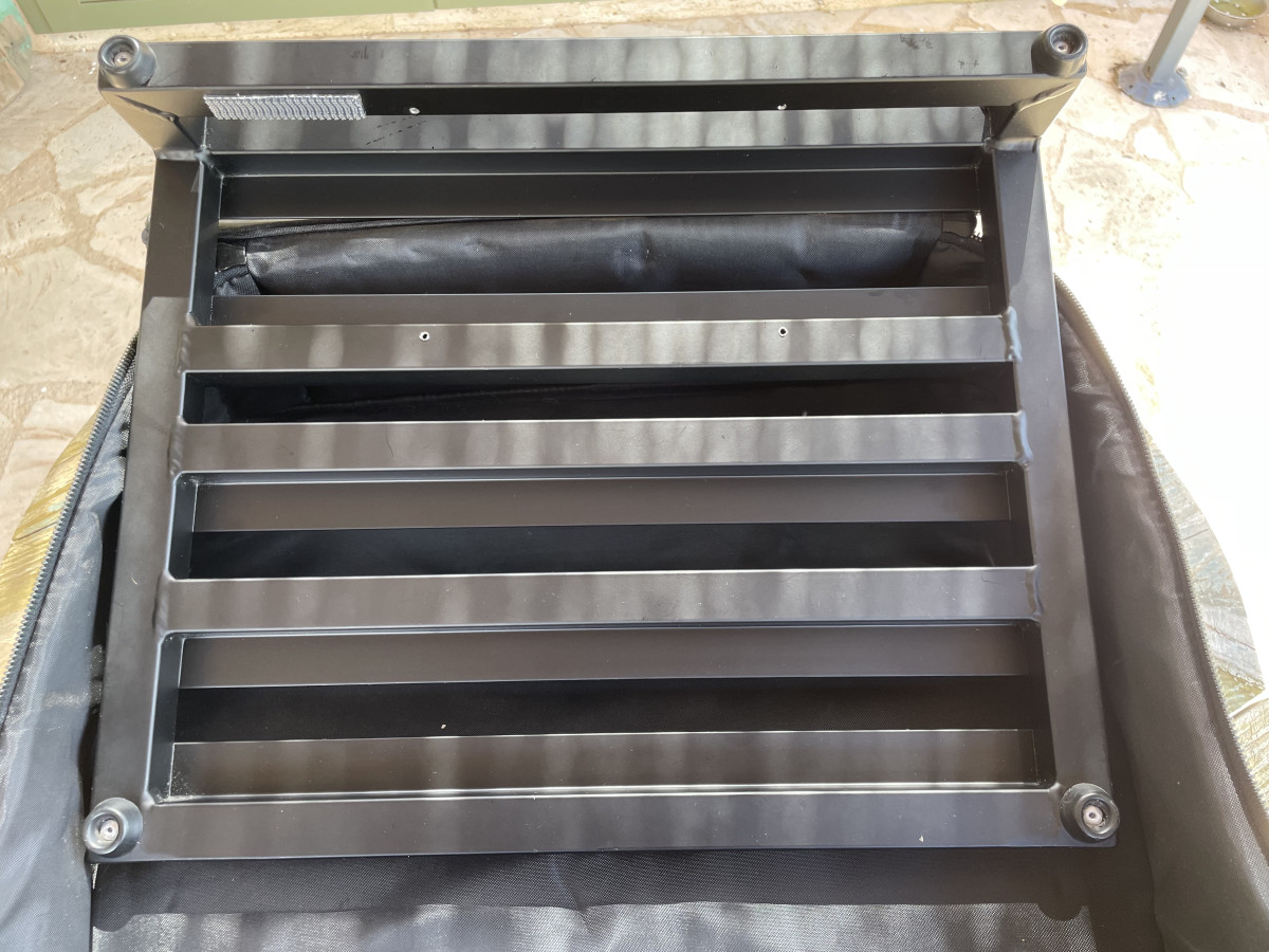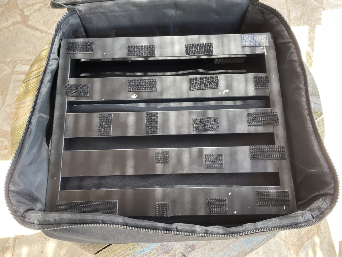 Vendo esta Pedaltrain por exceso de pedaleras (tengo otra igual y otra más pequeña). Como se aprecia en las fotos, tiene algunos desconches fruto de arrancar el velcro. Yo le pongo Dual Lock, que con eso los pedales no se despegan ni para atrás! En la parte trasera tiene los agujeros de haber llevado montada la fuente de alimentación. A parte de estos detalles estéticos, la estructura sigue siendo totalmente robusta y funcional.