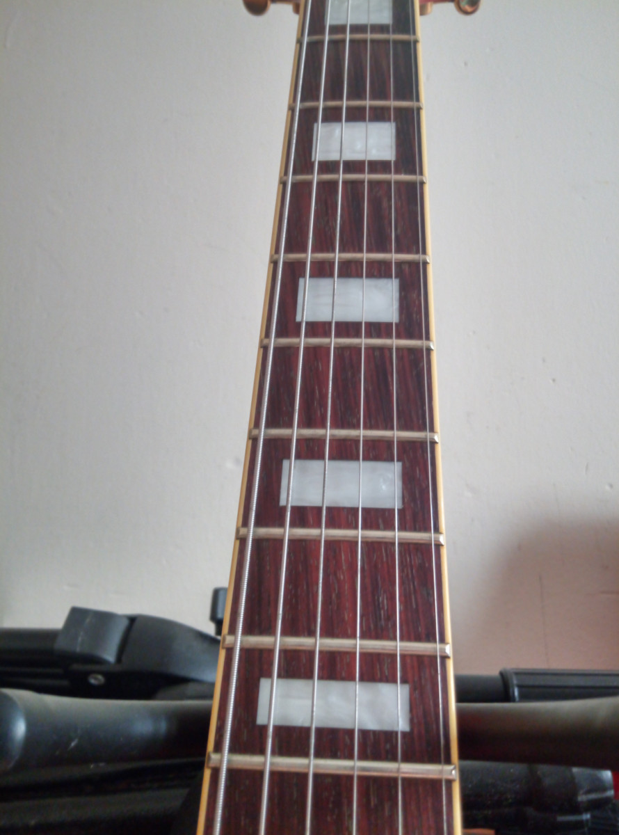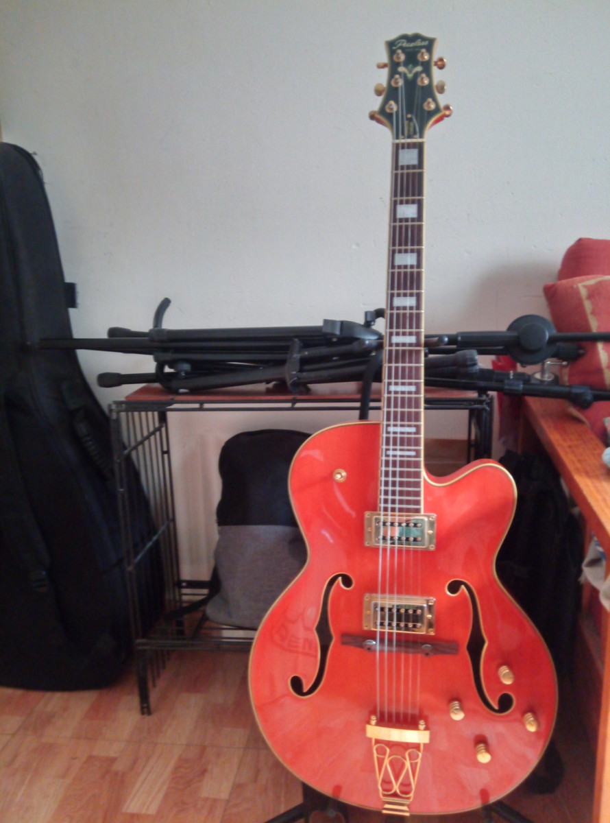 Vendo esta fabulosa guitarra para poder financiar otra que he visto por aquí. Tiene dos bolos contados y la única modificación que hice fue quitar el bigsby que traía y poner un cordal dorado y un puente de madera. Incluye funda de lujo de la misma marca